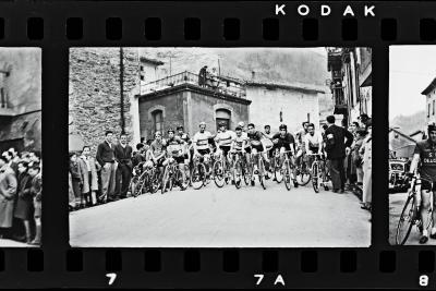 Retrato de equipo, en el centro dos ciclistas del equipo Caobaina
