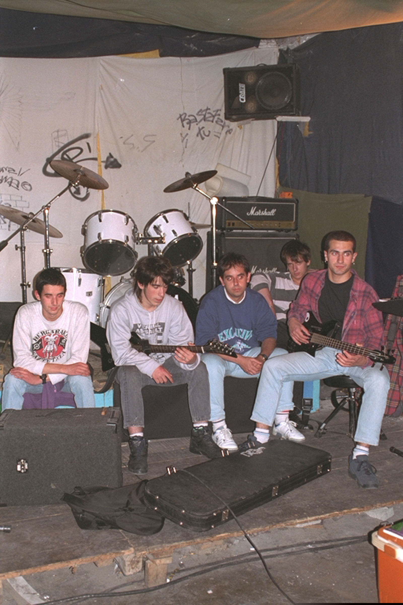 Retrato de grupo musical | Los cinco componentes de Daxka, en el local de ensayo que comparten con varias formaciones más [argazki-oina, arg.] |