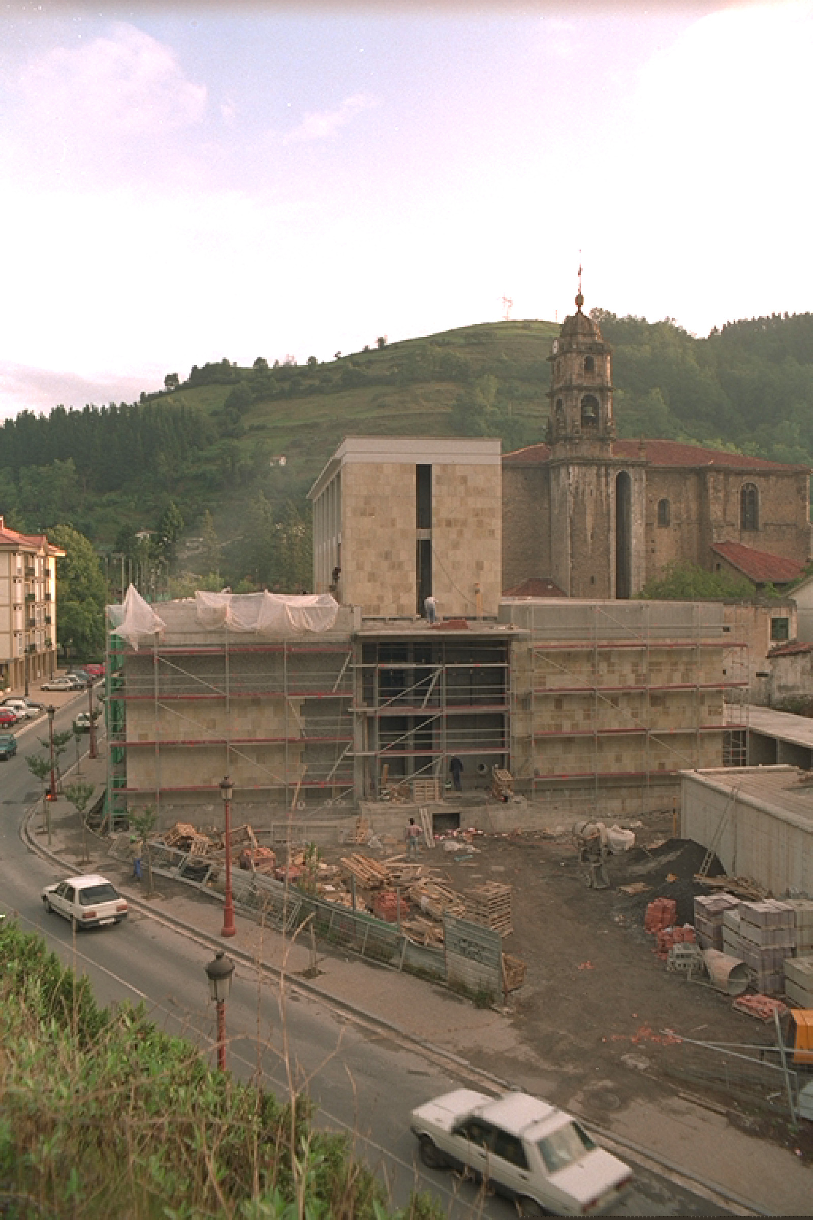 | Obras del nuevo mercado desde atrás; en segundo plano la torre de la iglesia de Santa Marina |