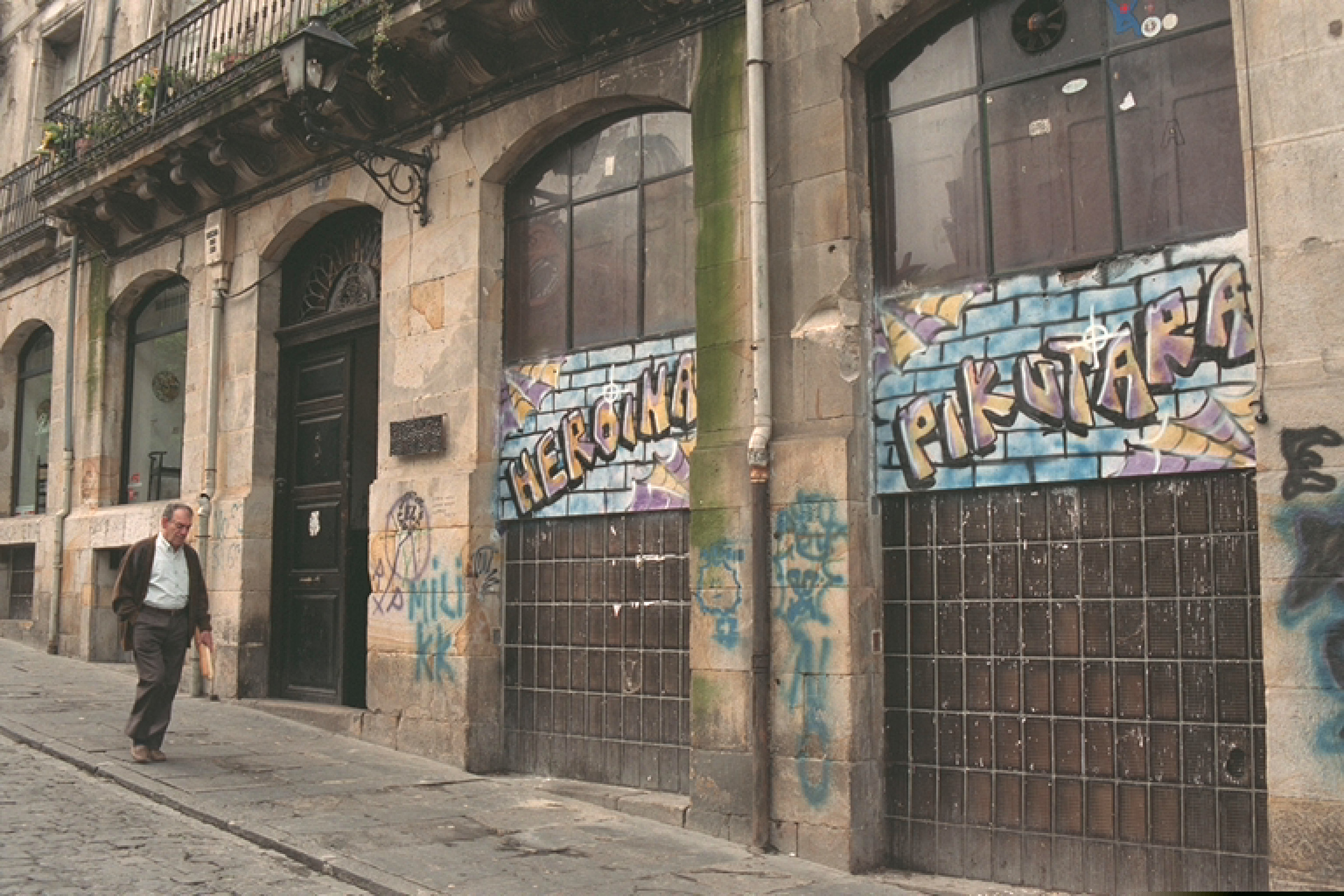 | Calle Komenio, pintadas en la fachada de la Asociación Juven | Los jóvenes del Gaztetxe han manifestado de diversas formas y en numerosas ocasiones su rechazo a la heroina [argazki-oina, arg.] |