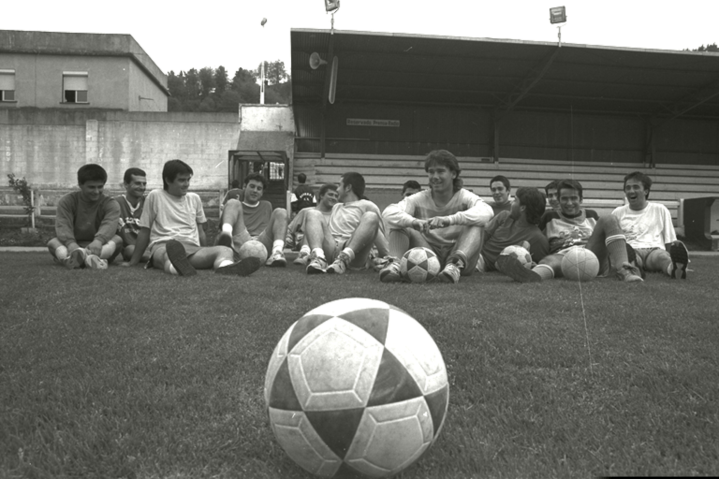| Jugadores sentados en el campo | El equipo del Club Deportivo Bergara que milita en la categoría de Segunda Regional ha cuajado una gran temporada. A sus aspiraciones de ascenso hay que sumar la aportación de jugadores al primer equipo [argazki-oina, arg.] |