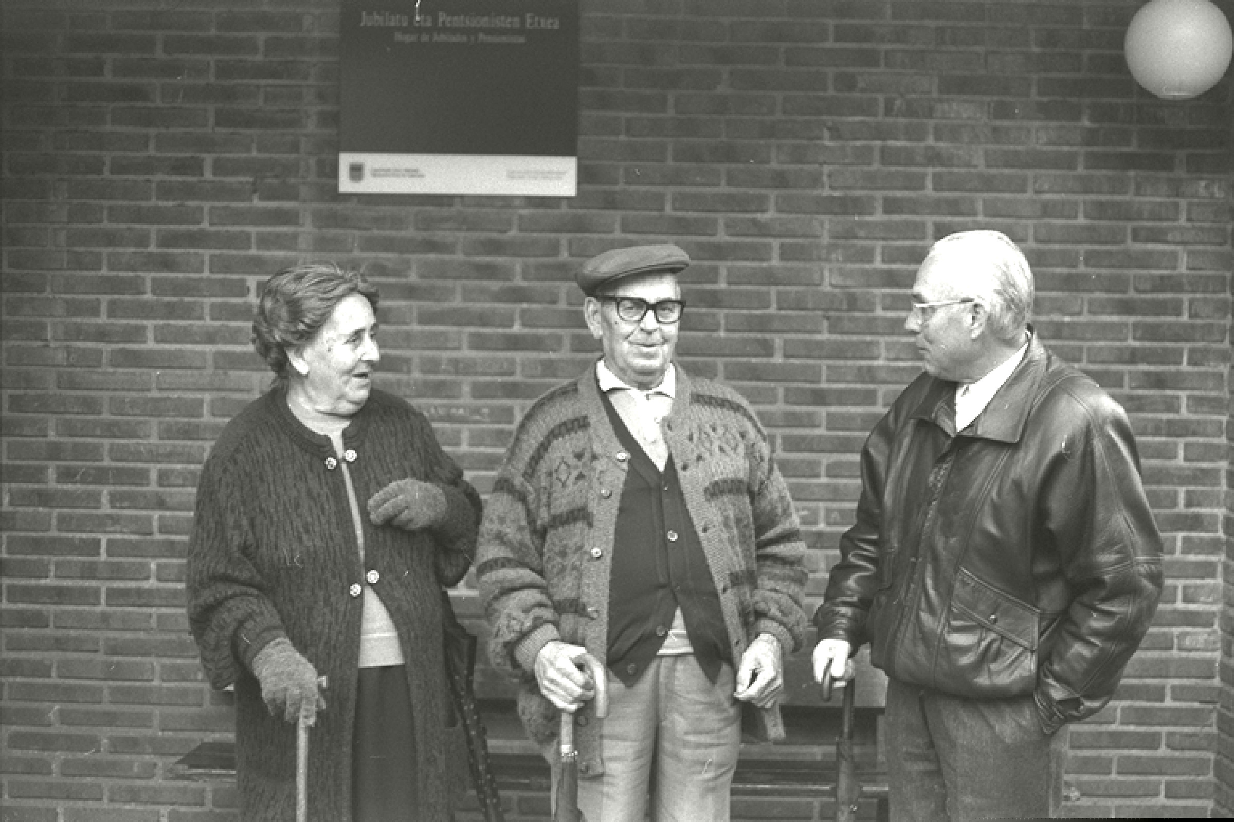 Tres personas en la entrada de la Asociación de Jubilados de la calle Boni Laskurain |