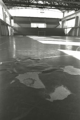 | Interior del Polideportivo de Labegaraieta | Polikiroldegiko parketa hainbat tokitan jasota eta zuloz beteta [argazki-oina, arg.] |