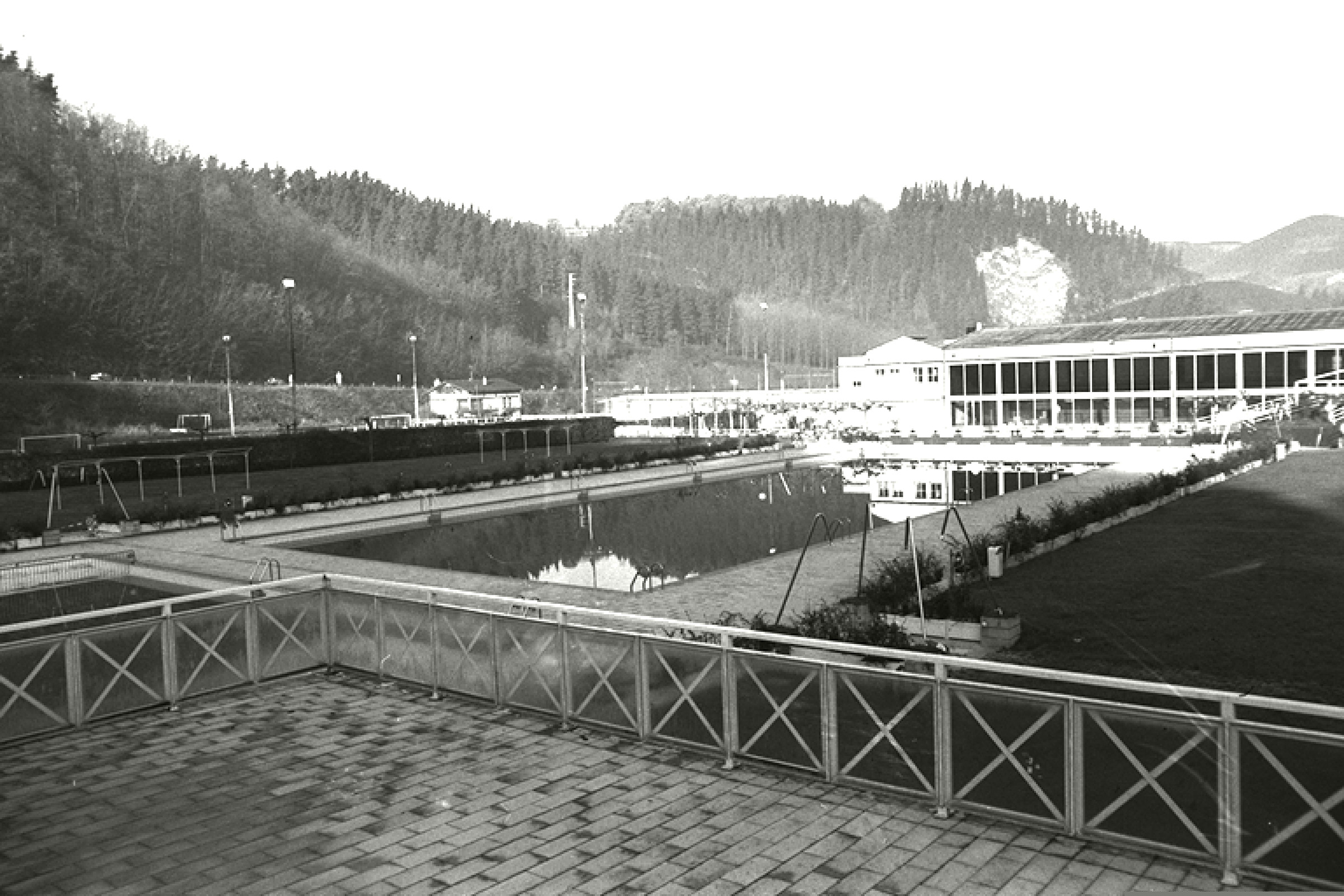 | Piscinas exteriores; construcción de piscinas en segundo plano | Otros de los proyectos en los que trabajó Promoción, la instalacion de las piscinas cubiertas, en el complejo deportivo de Agorrosin [argazki-oina, arg.] |