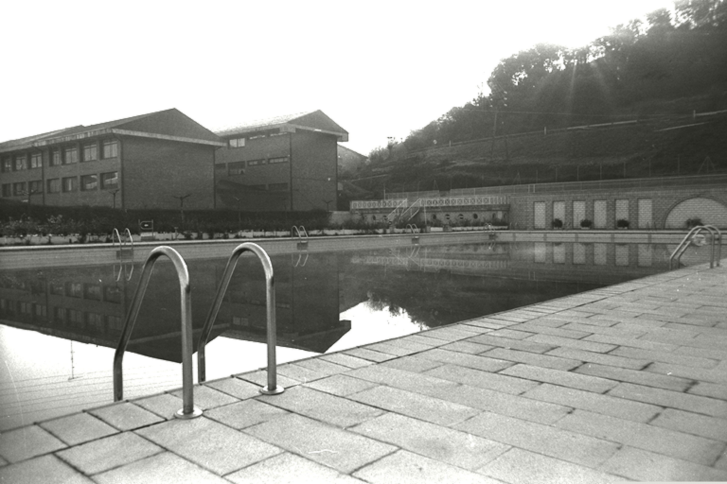 | Piscinas exteriores; en segundo plano el instituto |