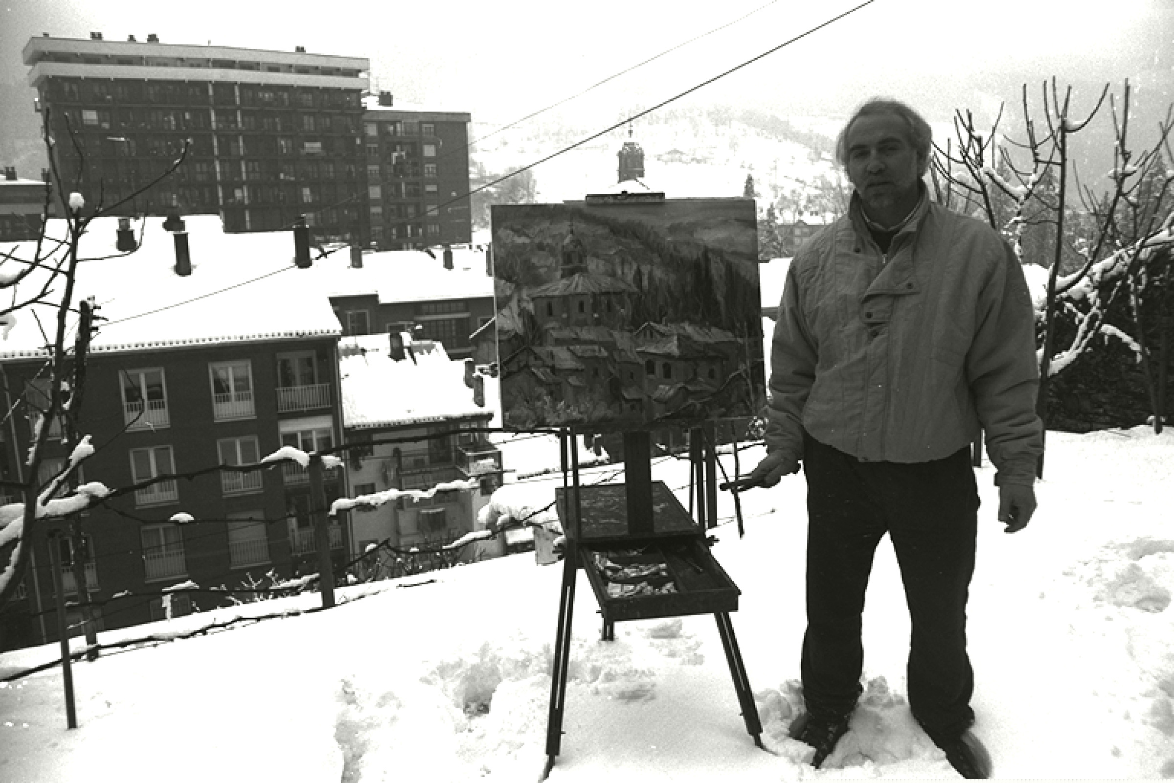 | Abdón Juaristi junto a su cuadro | En opinión de Abdón muy poca gente pinta realmente realista, y son menos los que lo hacen totalmente abstracto [argazki-oina, arg. Ariz Ondo, 29.a]; Abdón Juaristi poseía un estilo pictórico muy personal [argazki-oina, arg. Extra, 56.a] |