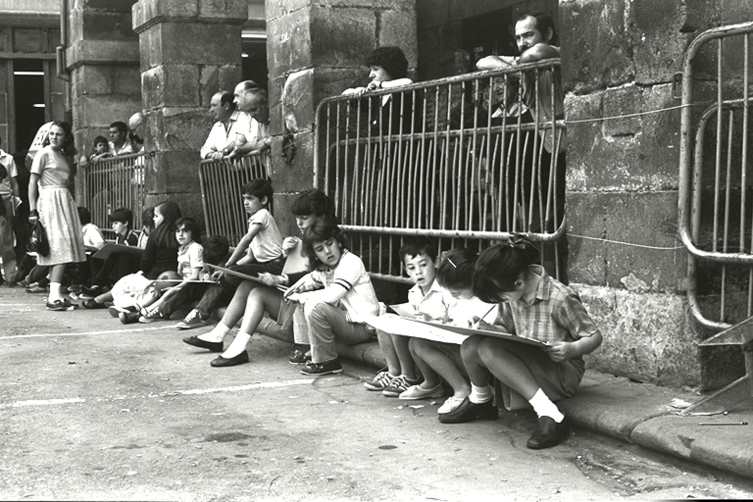 Niños haciendo dibujos en la plaza |