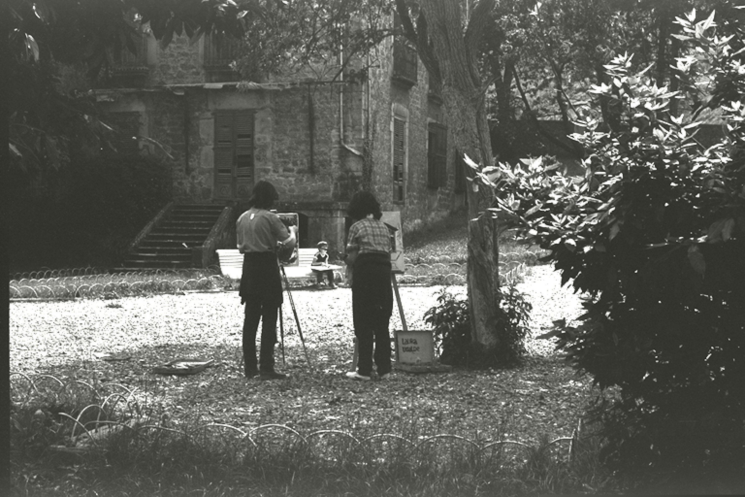 | Dos chicos dibujando en el jardín del palacio Errotalde |