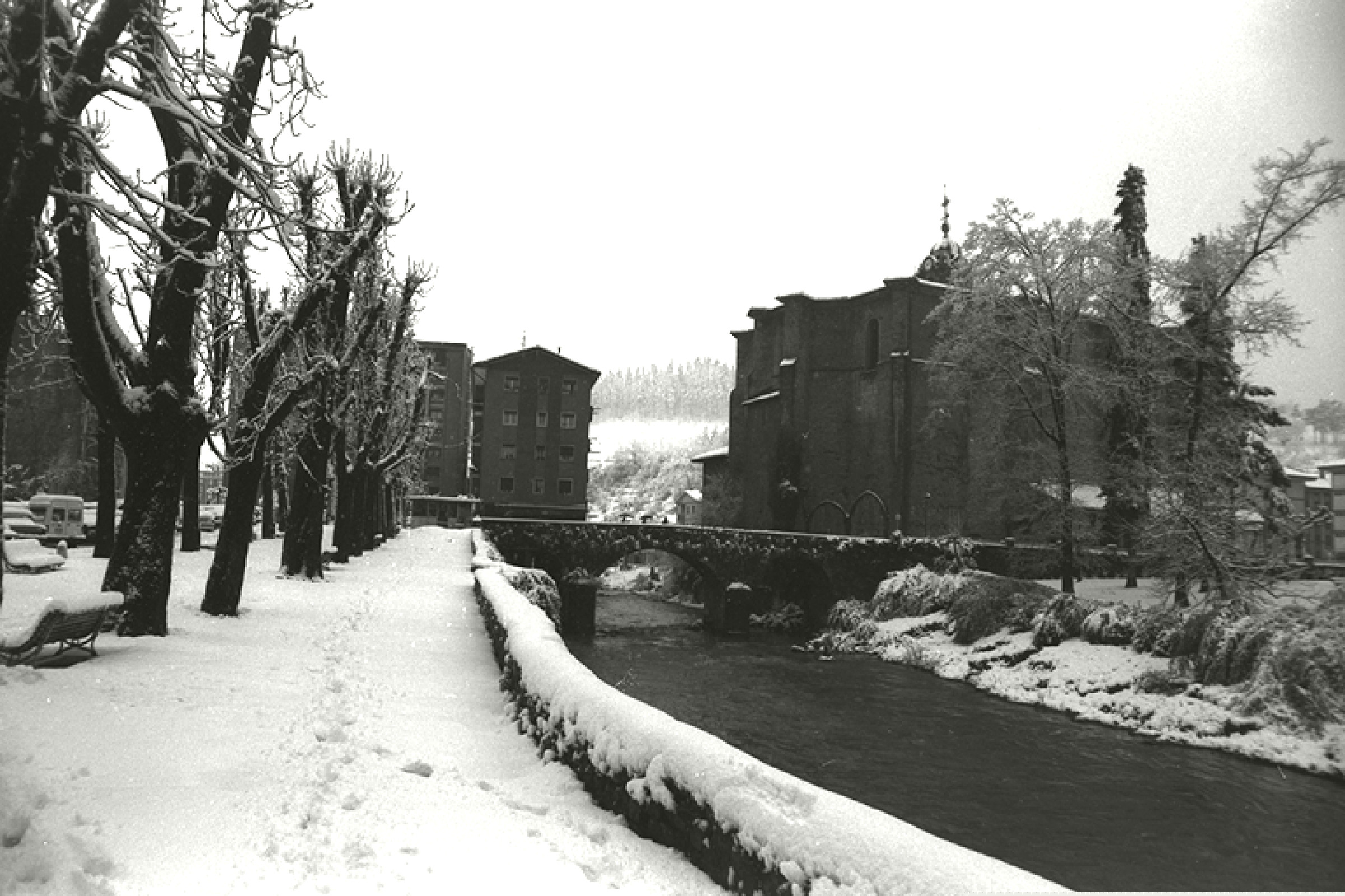 | Vista del puente de Santa Marina y la iglesia bajo la nieve desde Bideberri |