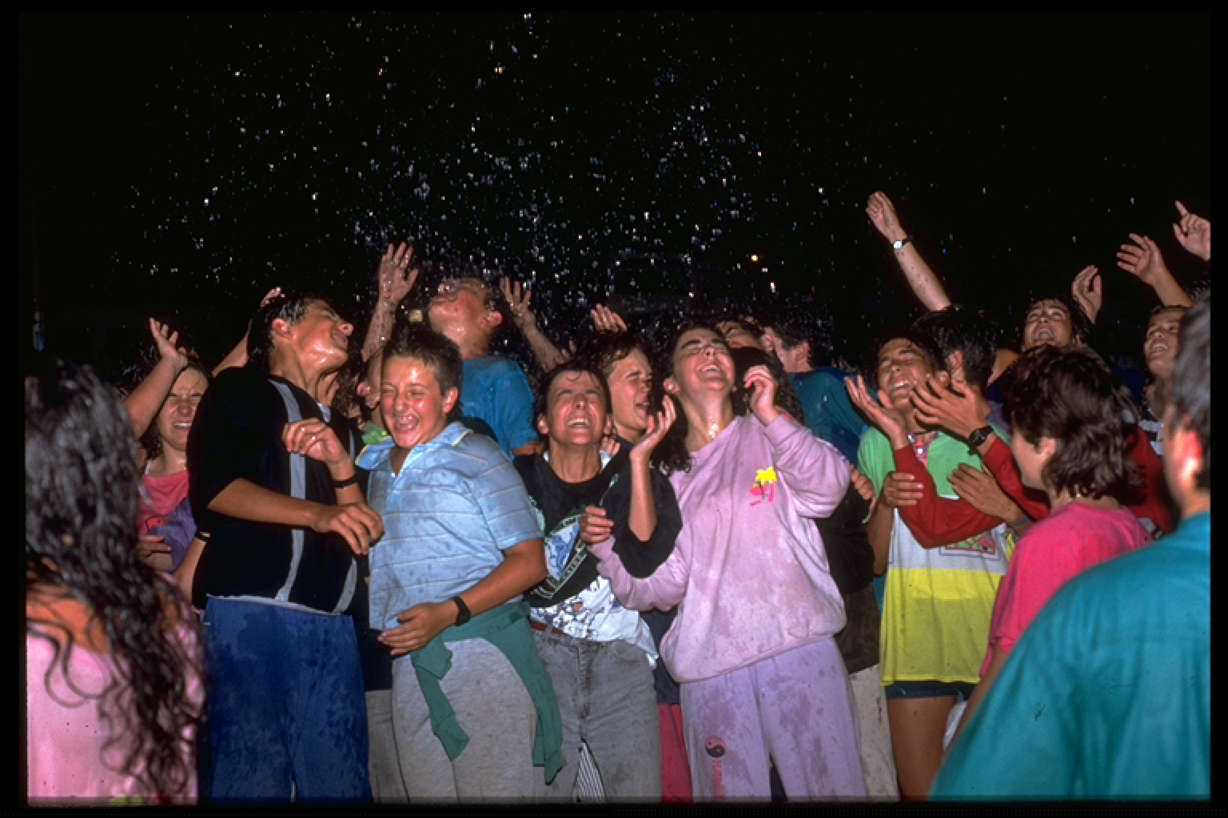 | El grupo se moja con el agua que se echa de los balcones durante las fiestas |