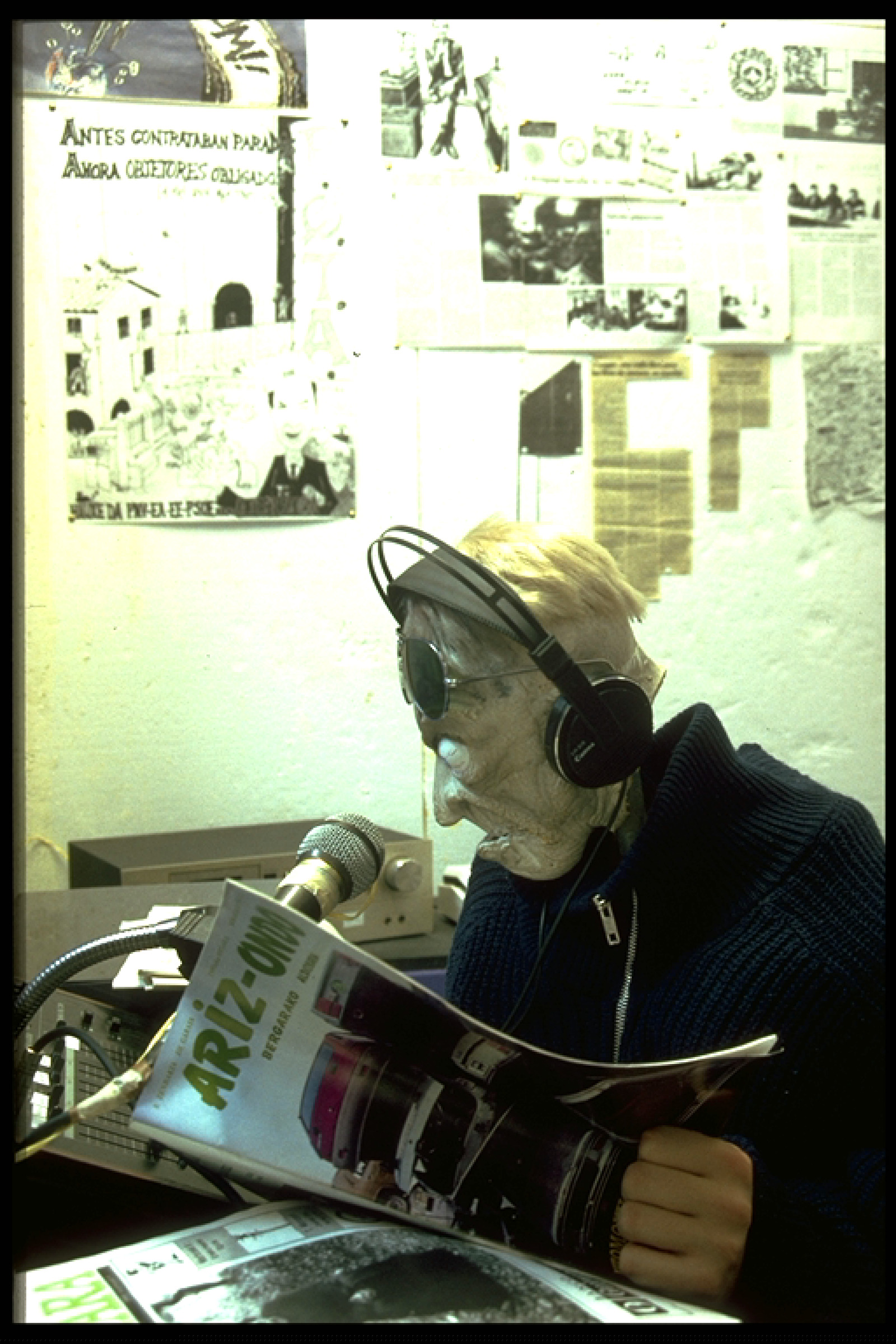 | Marioneta con la revista Ariz-ondo delante del micrófono |
