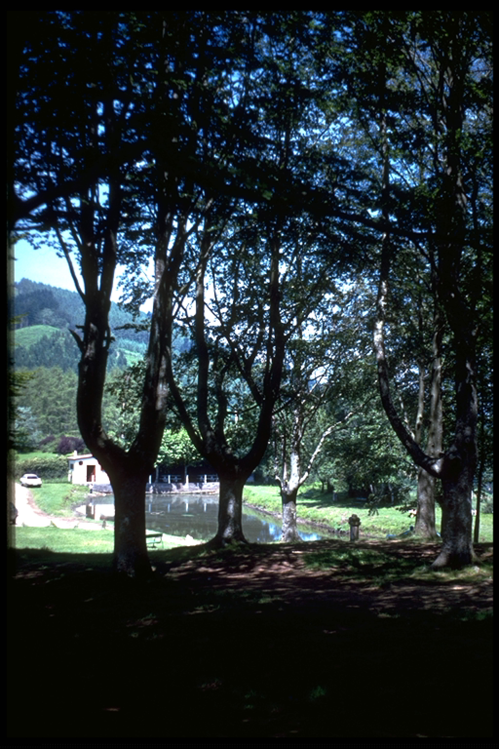 | Vista de Asentzio, tomada de la ermita, tras los árboles aparece el pozo y la chabola |