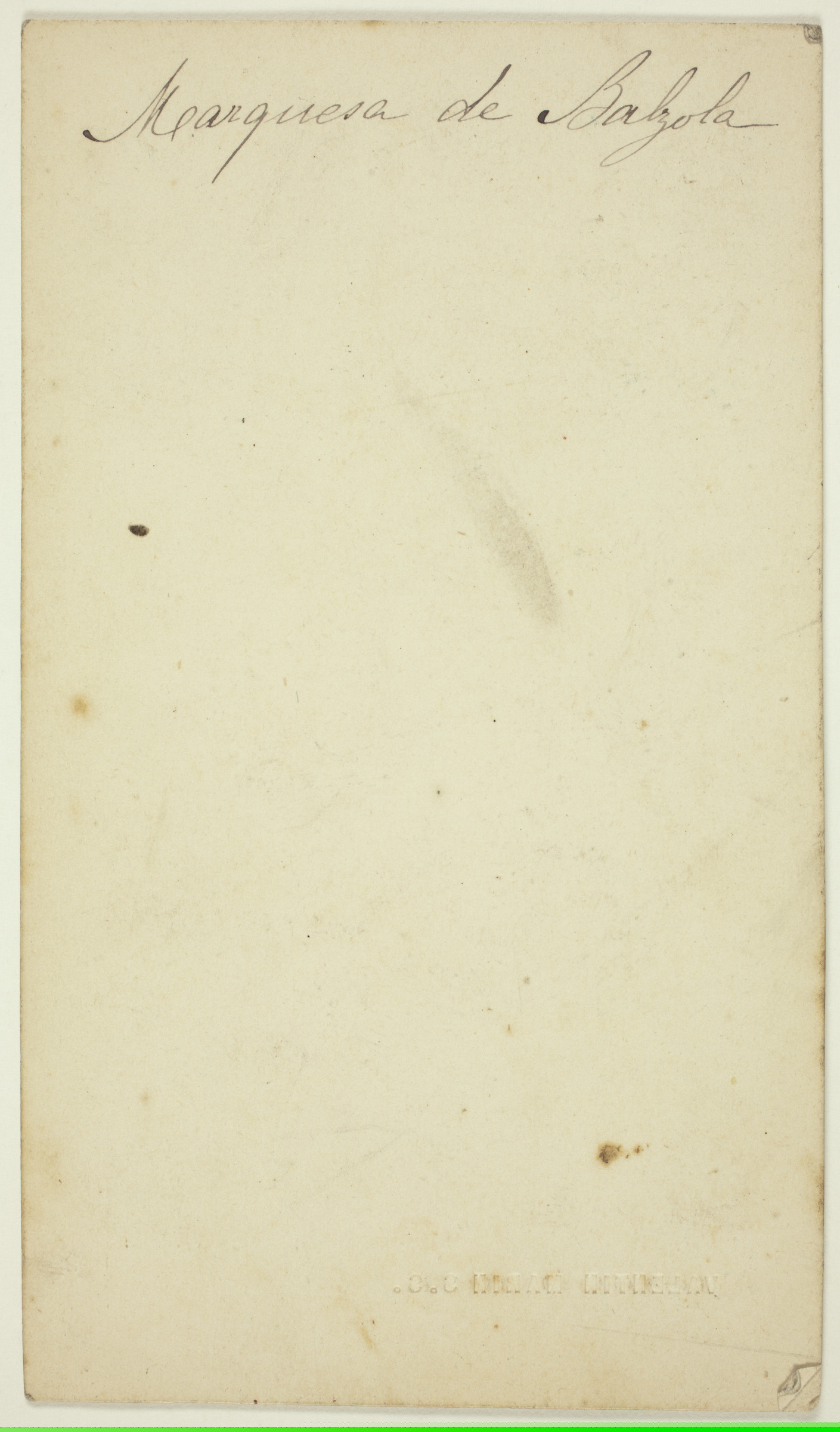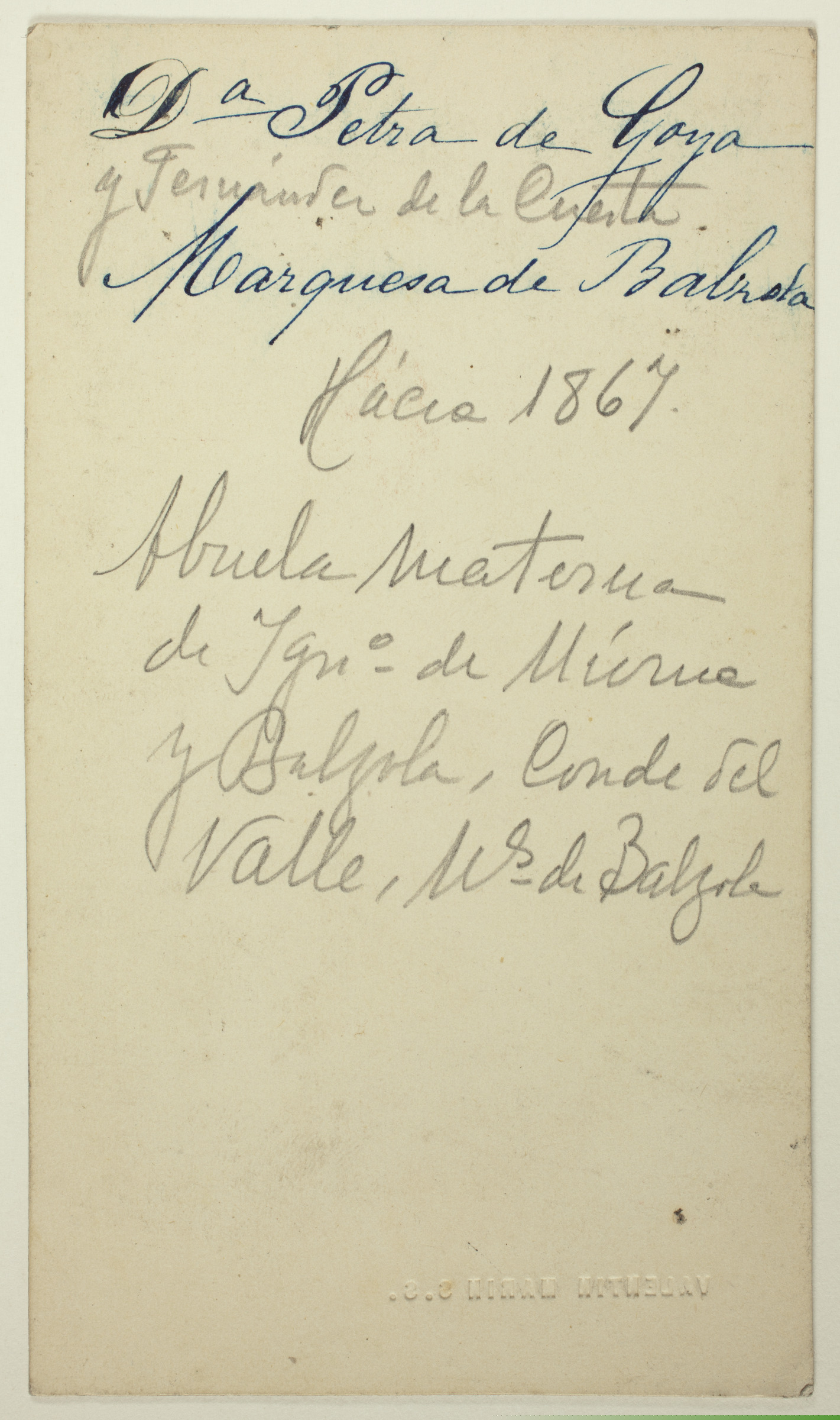 | Retrato de mujer | Dª Petra de Goya y Fernández de la Cuesta, Marquesa de Balzola, Hacia 1867. Abuela materna de Ignº de Múrua y Balzola, Conde del Valle, Ms. de Balzola [ms. v.]; Valentin Marin S.S. [imp. r.] |