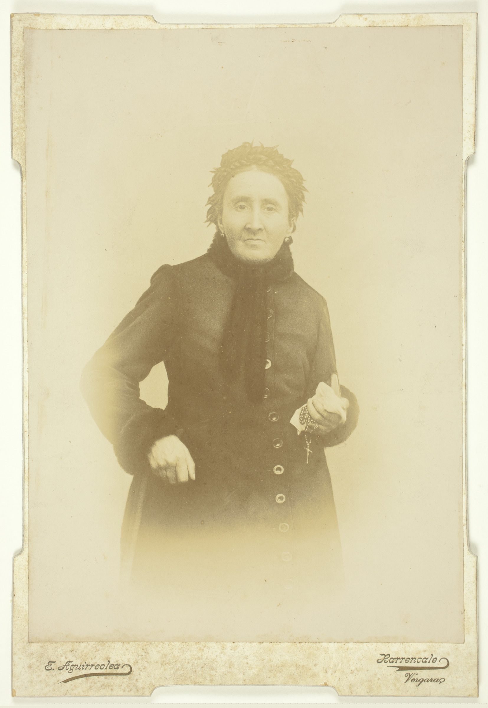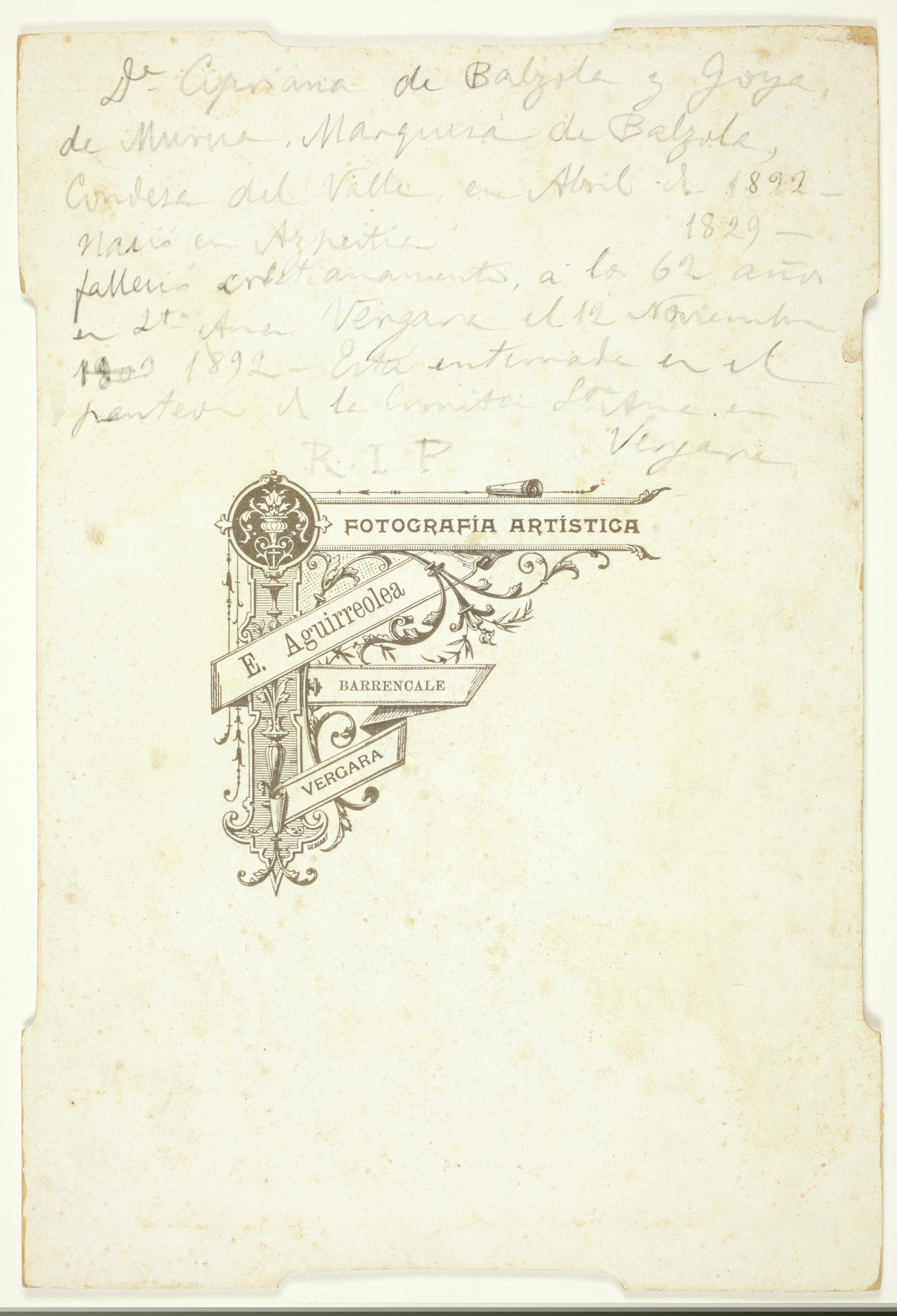 | Retrato de mujer | Dª Cipriana de Balzola y Goya, de Múrua, Marquesa de Balzola, Condesa del Valle, en Abril de 1892. Nació en Azpeitia 1829, falleció cristianamente, a los 62 años en Sta. Ana, Vergara el 12 de Noviembre 1892. Está enterrada en el panteón de la Ermita de Sta. Ana en Vergara R.I.P. [ms. v.]; E. Aguirreolea, Barrencale, Vergara [imp. r.]; Fotografía artística E. Aguirreolea, Barrencale, Vergara [imp. v.] |