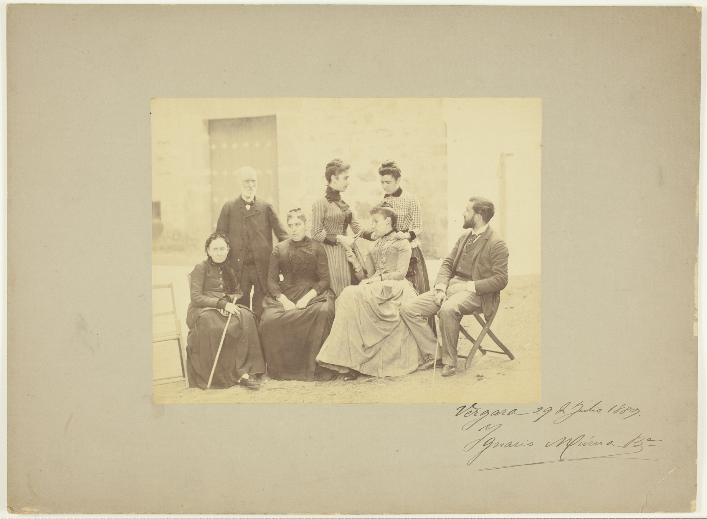 | Retrato colectivo frente a la casa: delante, sentados, tres mujeres y un hombre joven; de pie, un hombre mayor y dos mujeres jóvenes. | Vergara 29 de Julio 1889 [sinadura:] Ignacio Múrua Bª [ms. r.] |