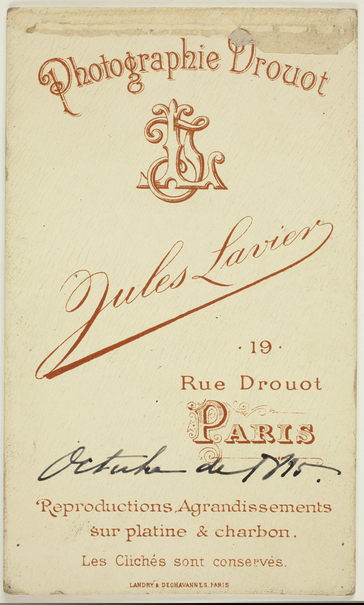 | Retrato de dos mujeres | Octubre de 1895 [ms. v.]; J. Lavier, Paris [imp. r.]; Photographie Drouot, Jules Lavier, 19 Rue Drouot , Paris [imp. v.] |