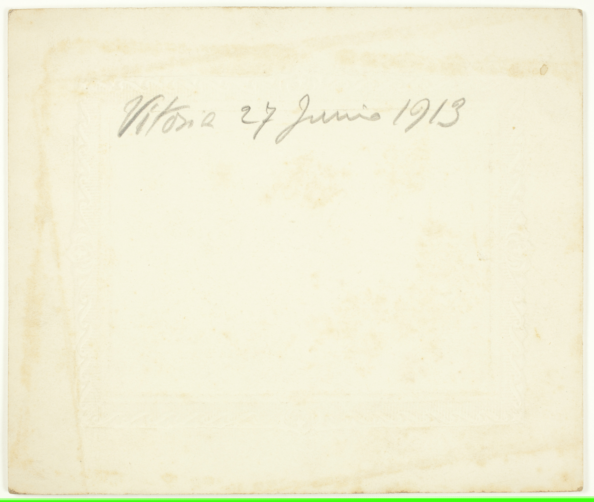 Retrato de grupo en las escaleras: en la parte superior de la escalera un hombre con un paraguas blanco y un niño, en el centro una mujer con un niño y en la parte inferior otro hombre con otro niño. La casa es Elio Urigoitia y se encontraba en la calle Senda. | Vitoria 27 Junio 1913, 1. José Mª Unceta y Urigoitia, 2. Luis Unceta y Murua, 3. Mª Esperanza Unceta y Urigoitia, Herminia Urigoitia de Unceta, Msa. de Casa Jara, 5. Mª del Pilar Unceta y Urigoitia, Pablo de Velasco [ms. v.] |