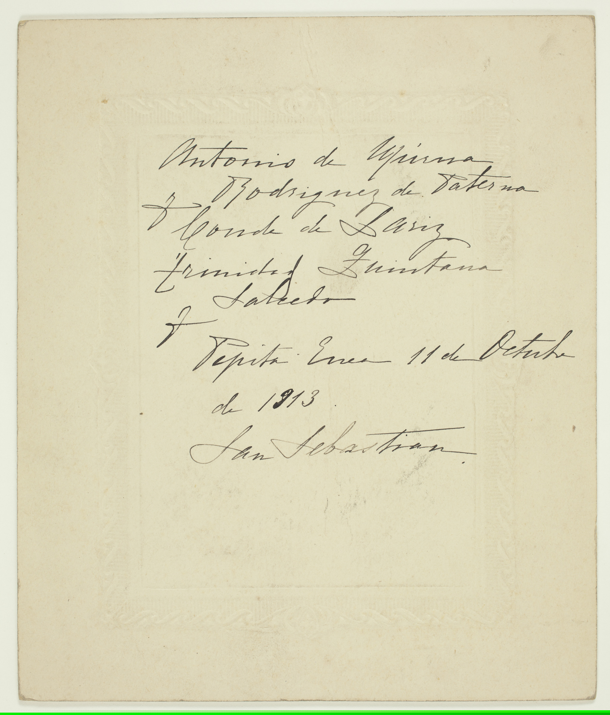 | Retrato de la pareja el día de la boda | Antonio de Múrua y Rodríguez de Paterna, Conde de Láriz, Trinidad Quintana y Salcedo, Pepita Enea 11 de Octubre de 1913, San Sebastián [ms. v.] |