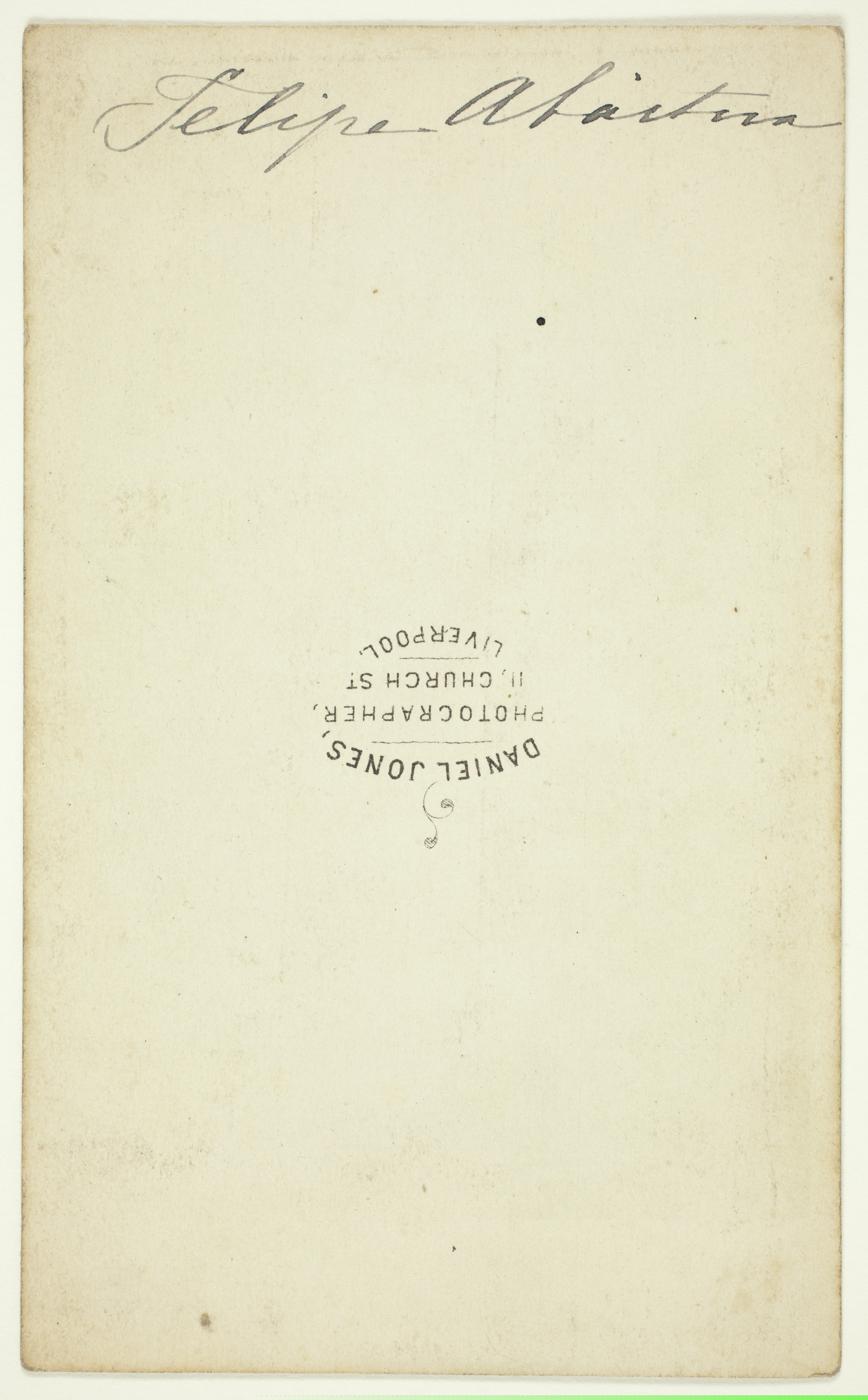 | Retrato de hombre | Felipe Abaitua [ms. v.]; Daniel Jones, Photographer, 11 Church St., Liverpool [imp. v.] |
