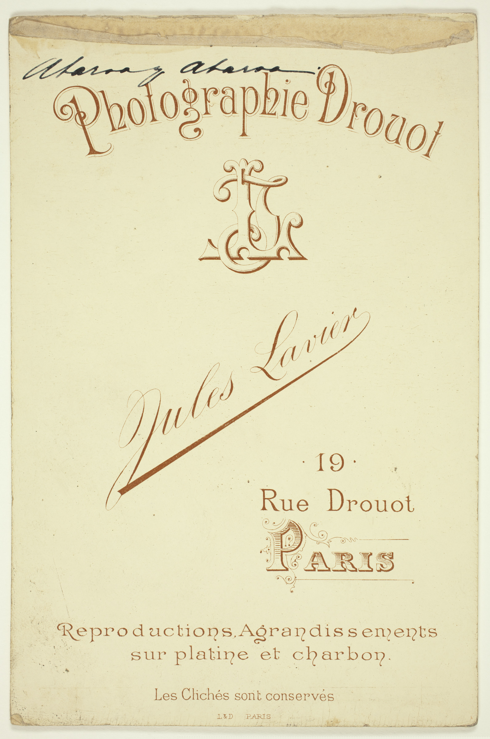 | Retrato niña | [sinadura:] María Luisa, 1895 [ms. r.]; Abaroa y Abaroa [ms. v.]; J. Lavier, Paris [imp. r.]; Photographie Drouot, Jules lavier, 19 Rue Drouot, Paris [imp. v.] |