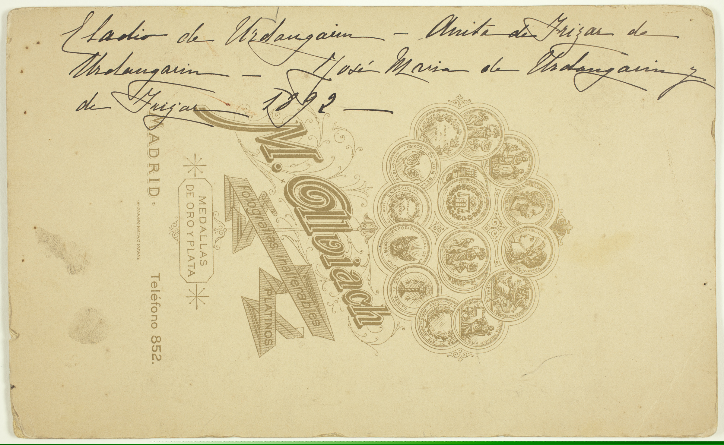 Retrato familiar. | Eladio de Urdangarin - Anita de Irizar de Urdangarin - José María de Urdangarin y de Irizar, 1892 [ms. v.]; Alviach, Madrid, Puerta del Sol 14 [imp. r.]; M. Alviach, Madrid [imp. v.] |