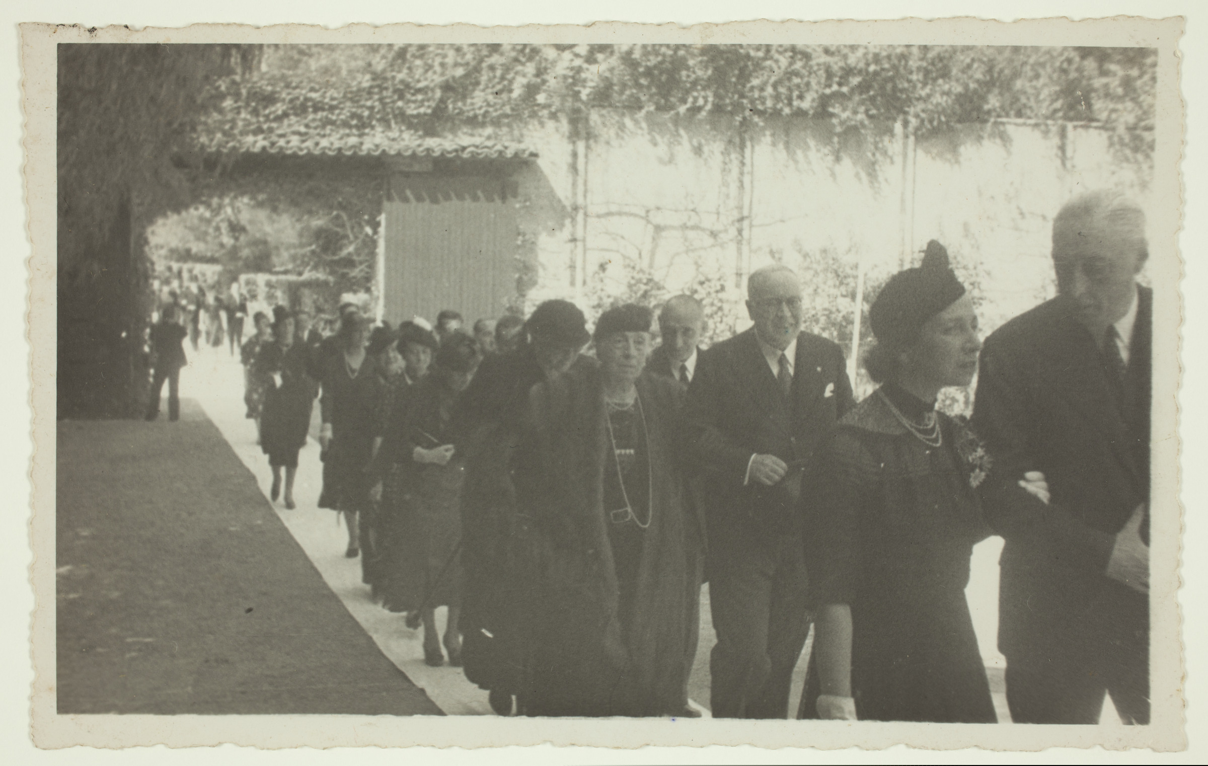 | Colas en el jardín, gente pasando por encima de la alfombra | 3/4 [ms. v.]; Photo-Carte, Fuenterrabía, 6, Reportaje de Actualidad, San Sebastián [imp. v.] |