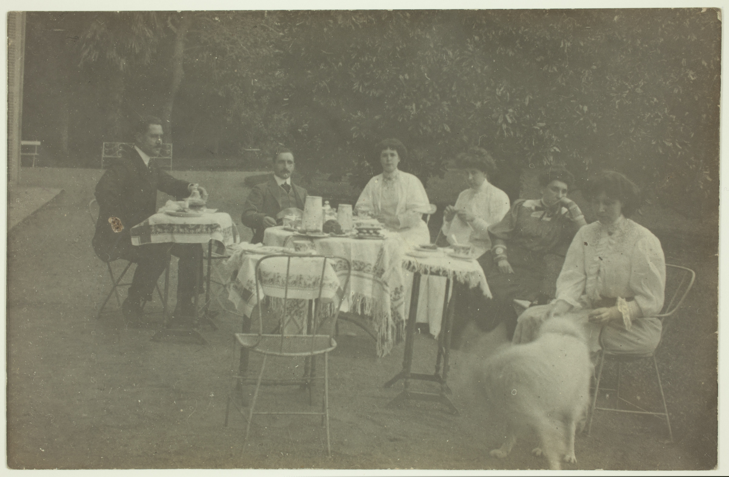 | Grupo merendando en el jardín | Familia del Ms. de Camarasa y Alfonso Ms. de Rafal, Carrère, Francia, 8bre 1908 [ms. v.] |