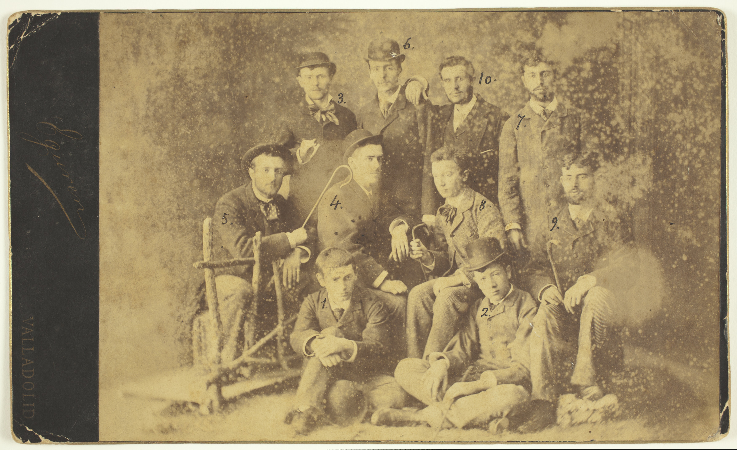 Retrato colectivo | 1 [sinadura:] Pedro Tutor Bernedo, 2. [sinadura:] José Orueta y Nenín, 3. [sinadura:] Vicente Monzón y Lardizabal, 4. [sinadura:] Daniel Irujo y [?], 5. [sinadura:] Ramón Camio y Cruzada, 6. [sinadura:] Juan MadinaVeitia y Ortiz de Zárate, [7.] [sinadura:]Ruiz de Eguino y Lizaso, [8. Gabriel] [sinadura:]de Goiri y Loyola, 9. [sinadura:] Minondo y Azcobereta (Antonio), 10. [sinadura:]Ignacio Múrua Balzola, En Valladolid á 31 de Mayo 1882 [ms. v.]; Eguren, Valladolid [imp. r.] |
