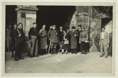 Retrato colectivo en soportales | Elorrio 25 de Abril de 1937, D. Ignacio Lizo, Cte. Militar de Vergara (con bastón), Srta. Urraca Pastor, detrás el Conde del Valle, D. José Arellano (con sombrero) Gobernador Civil de Guipúzcoa y Vizcaya, detrás D. Luis Ruiz de la Prada [ms. v.] |