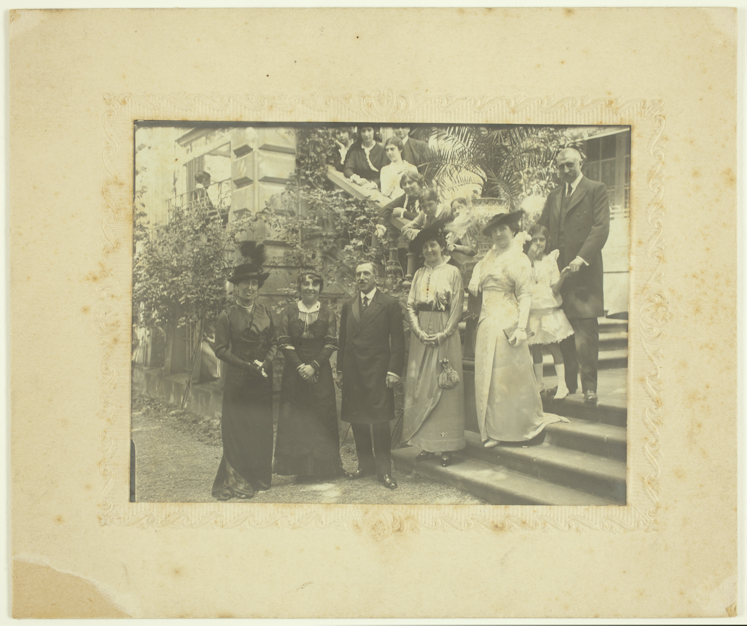 Retrato de grupo en las escaleras de una casa | S. Sebastián 11 Octubre 1913, Visitación Quintana de García, ..., Pablo García Ogara, Encarnación Múrua y Rodríguez, Pepita Samaniego, Msa. Vda. de Múrua, ... Múrua y Samaniego, Pepe Murua y Rodríguez [ms. v.] |