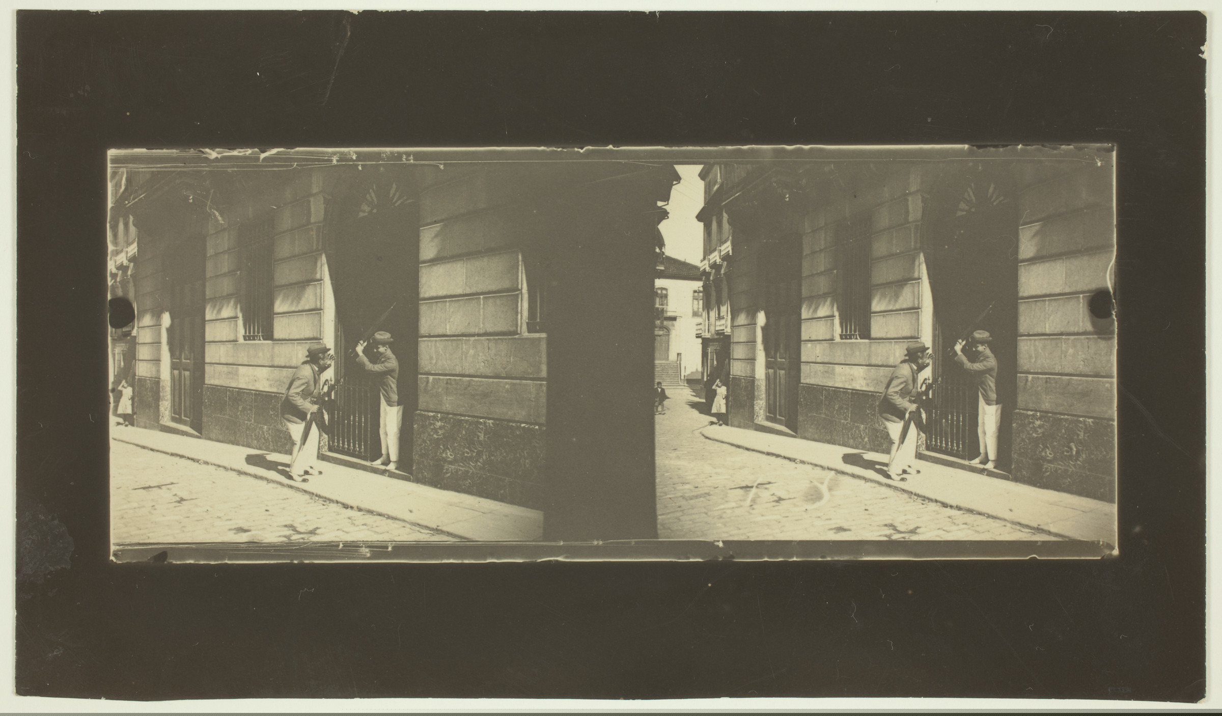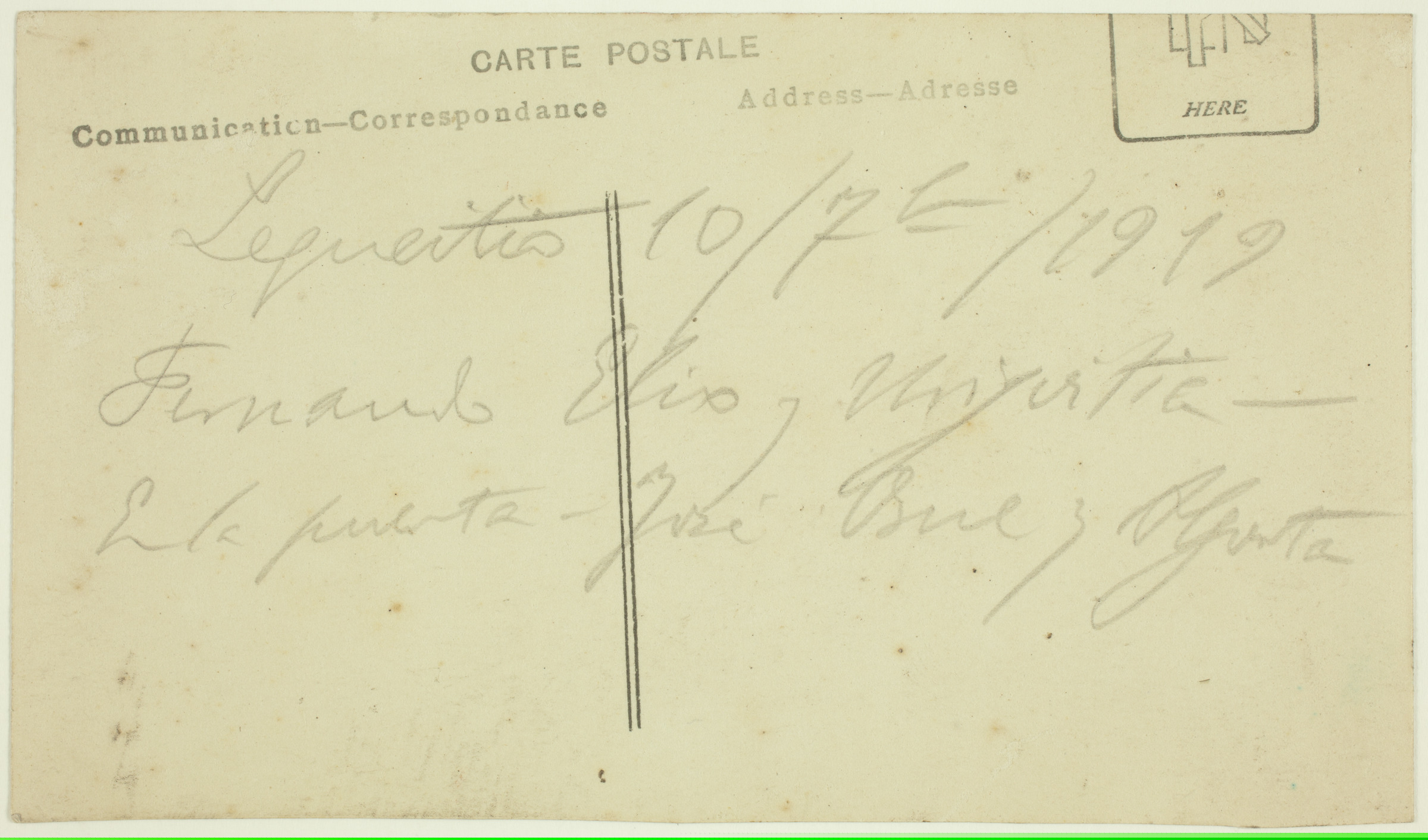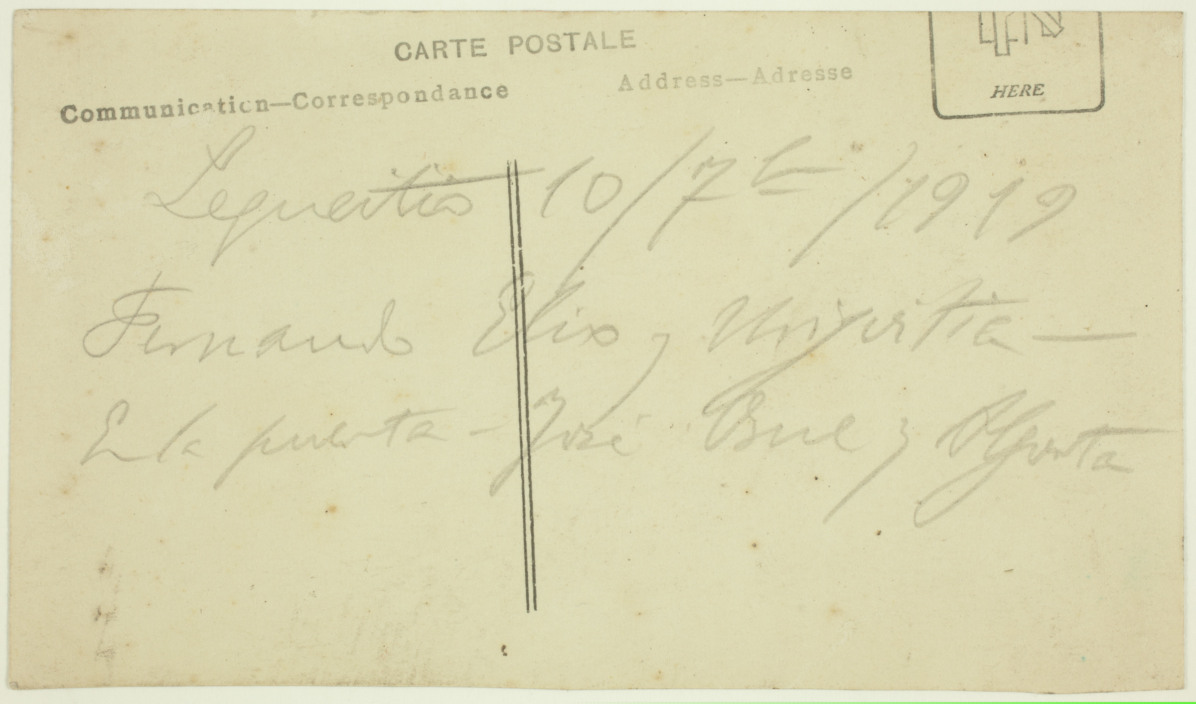 | Dos hombres vestidos iguales en el exterior de un portal | Lequeitio 10/7bre/1919, Fernando Elio y Urigoitia - en la puerta- José Orue y Algorta [ms. v.] |