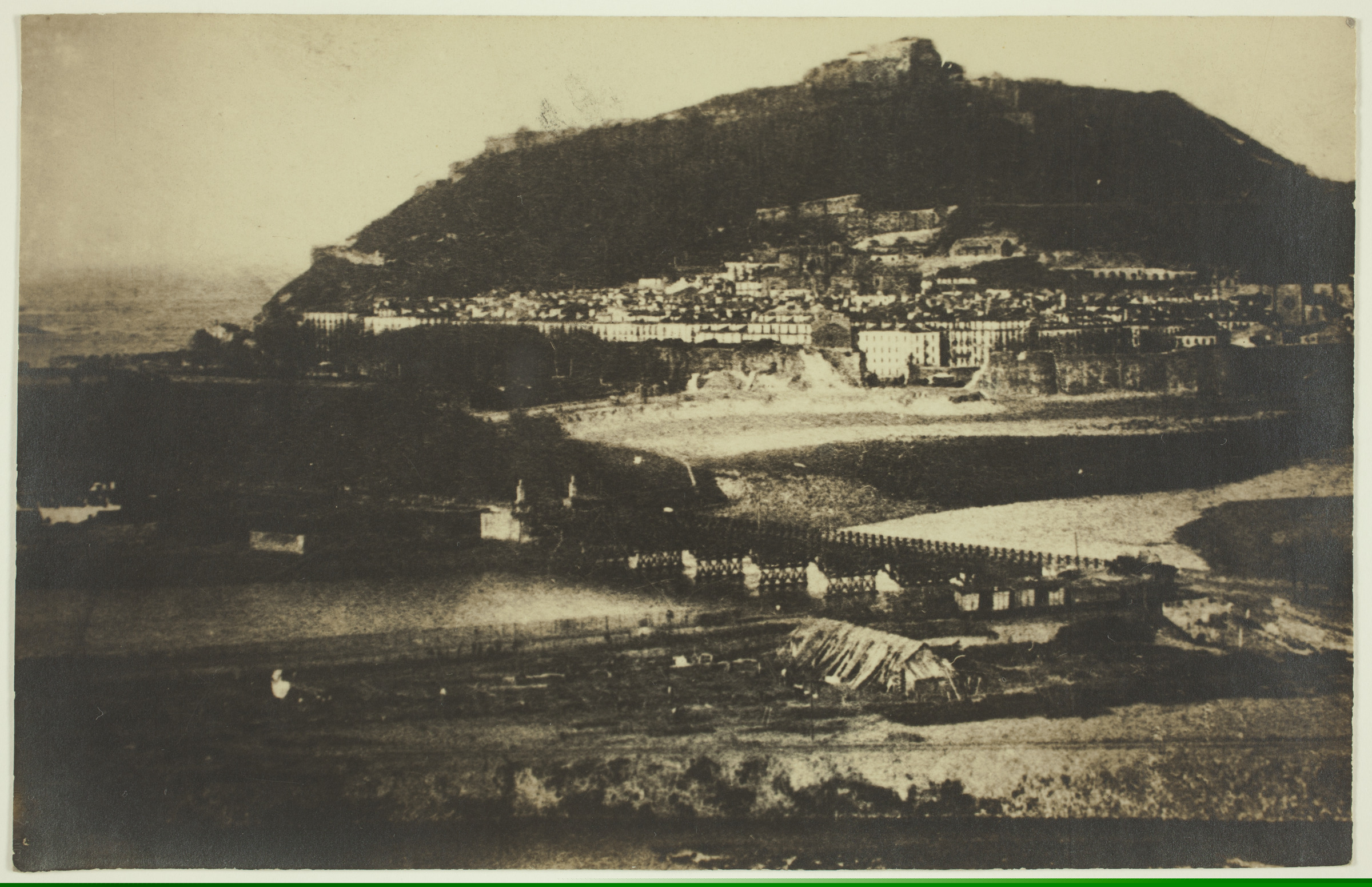 | Vista de San Sebastián, primer plano de Gros, segundo puente de Santa Catalina, tercero ciudad y muralla (parte derruida) | El puente de Sta. Catalina y parte de muralla derribada frente a la calle Sn. Juan [ms. v.]; fotografía M. Aguirre, Alameda, 11, San Sebastián [imp. v.] |