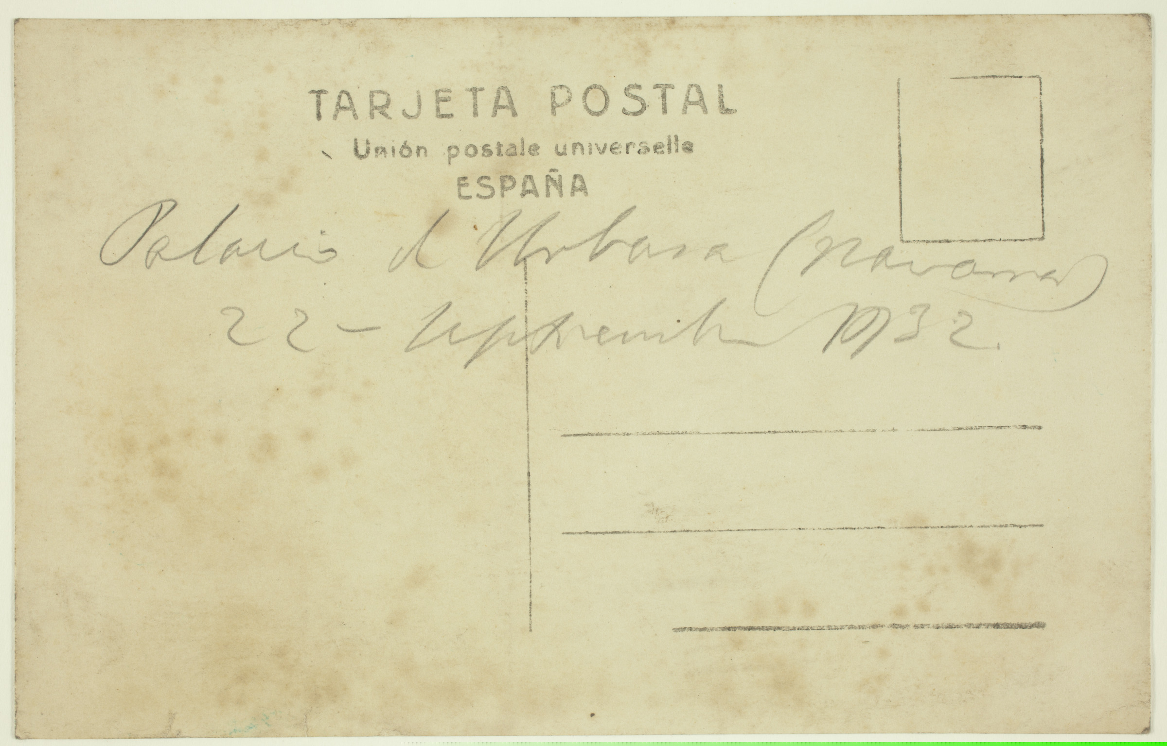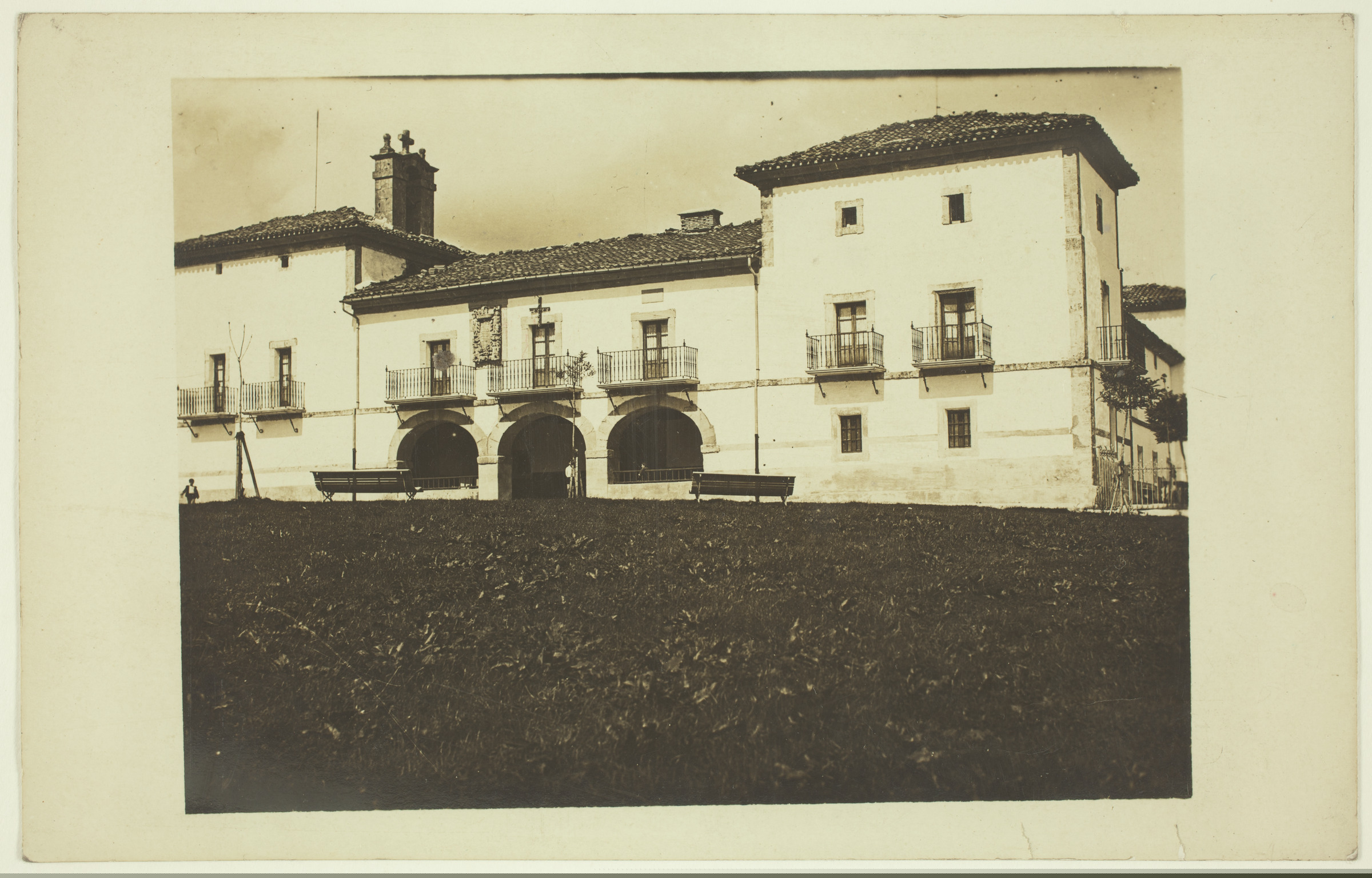 | Fachada del palacio, a la izquierda campanario: dos personas en el pórtico de entrada, un niño a la izquierda | Palacio de Urbasa (Navarra) 22 Septiembre 1932 [ms. v.] |