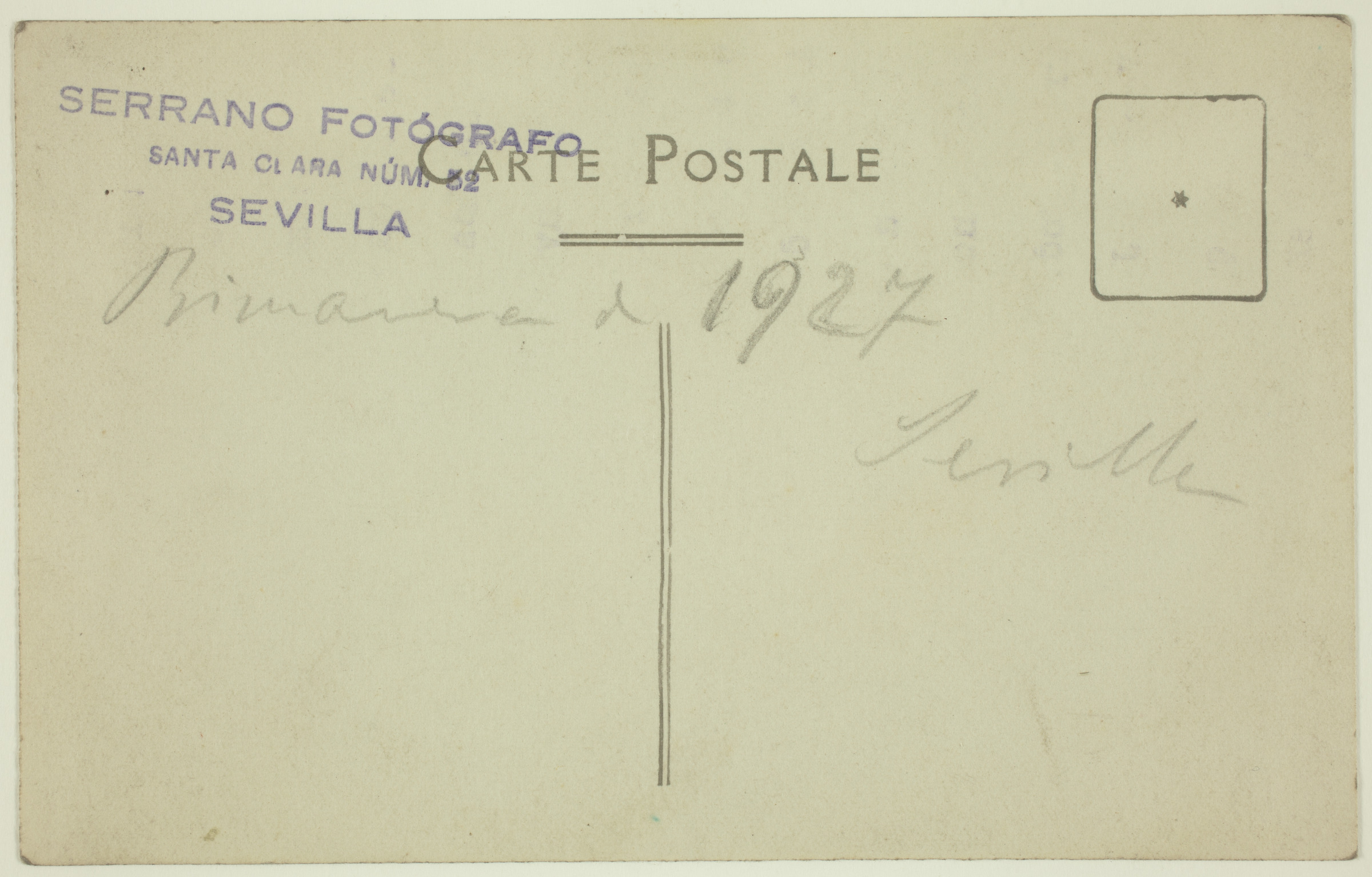 | Hombres montando a caballo guiando a la vacas; coches parados a la izquierda y gente sacando fotos | Primavera de 1927, Sevilla [ms. v.]; Serrano fotógrafo, Santa Clara nº 32, Sevilla [imp. v.] |