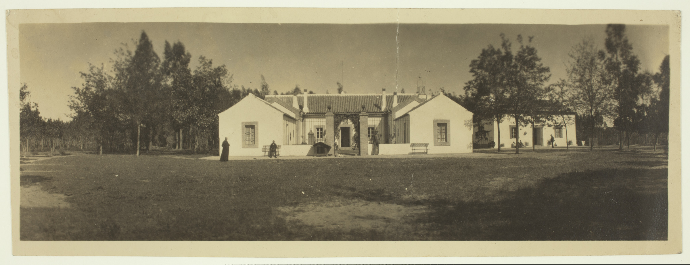 | Fachada de la casa, tres hombres delante | Cumbres Hermosas, Casa forestal, Almonte (Huelva), Abril 1922 [ms. v.] |