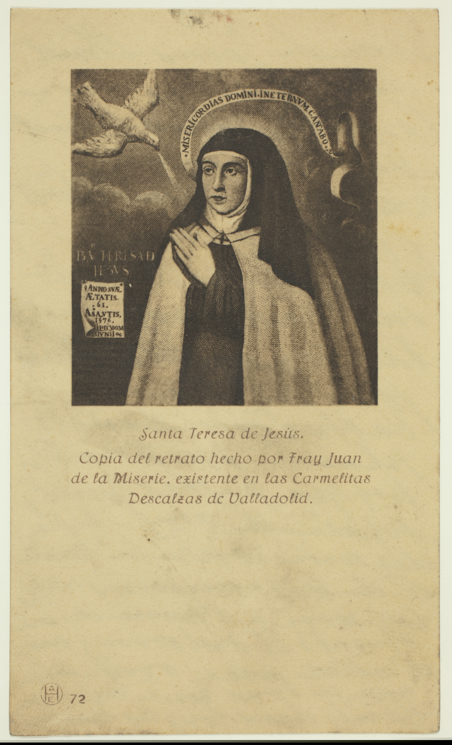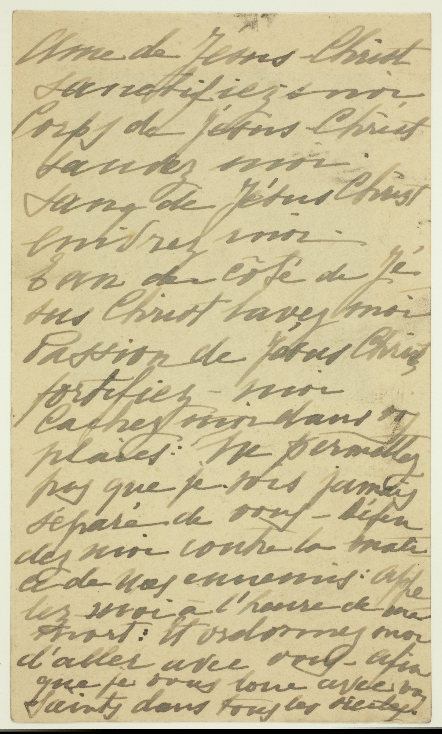 | Imagen religiosa: Santa Teresa | Ame de Jésus Christ, sanctifiez moi, Corps de Jésus Christ sauvez moi, Sang de Jésus Christ enivrez moi, San[g?] du côté de Jésus Christ lavez moi, Passion de Jésus Christ fortifiez-moi, Cachez moi dans vos plaies: ne permetttez pas que je sois jamais séparé de vous - défendez moi contre la malice de nos ennemis. Appelez moi à l'heure de ma mort, et ordonnez moi d'aller avec cous - afin que je vous loue avec vos saints dans tous les siècles [ms. v.]; Santa Teresa de Jesús. Copia del retrato hecho por Juan De la Miserie, existente en las Carmelitas Descalzas de Valladolid [imp. r.] |