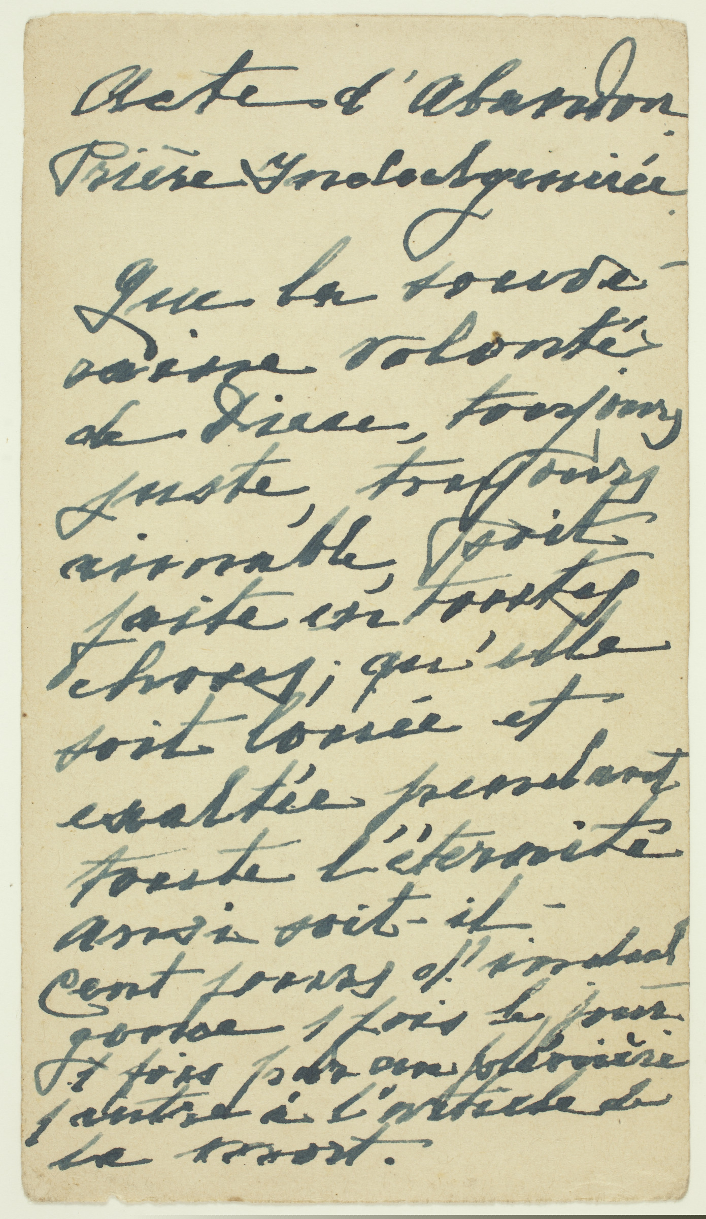 | Imagen religiosa: Catalina Labouré | Acte d'Abandon, Prière indulgenciée. Que la souveraine volonté de Dieu, toujours juste, toujours aimable, soit faite en toutes choses; qu'elle soit louée et exaltée pendant toute l'éternité ainsi soit-il. Cent jours d'indulgence, 1 fois le [?]jour, 1 fois par an, prémière, 1autre à l'article de la mort [ms. v.]; B. Catharina Labouré, Mod. Registrado, Casa Bañeras nº 14 [imp. r.] |