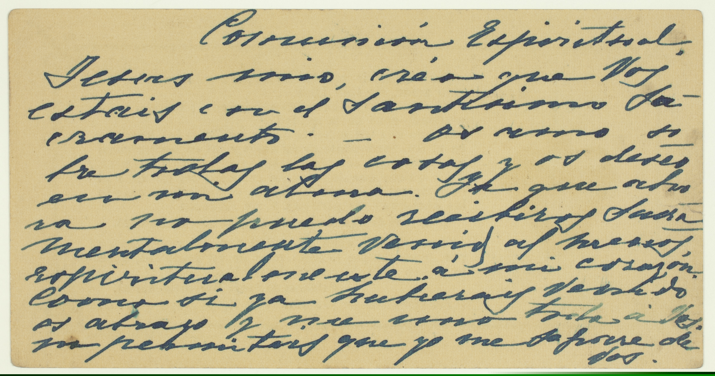 | Imagen religiosa: el corazón de Jesús | Comunión Espiritual, Jesús mío, créo que Vos estáis con el Santísimo Sacramento. - Os amo sobre todas las cosas y os deseo en mi alma. Ya que ahora no puedo recibiros Sacramentalmente venid al menos, espiritualmente a mi corazón. Como si ya hubierais venido os abrazo y me uno toda a Vos, no permitais que yo me separe de Vos [ms. v.]; Amar y sufrir sea tu divisa; un solo corazón, un solo amor, un solo Dios [...] (Palabras de N.S. Jesucristo a S. Margarita Alacoque). O corazón de amor yo pongo toda mi confianza en vos, pues aunque lo temo todo de mi debilidad, pero lo espero todo de vuestra bondad (Palabras de Santa Margarita-María), Indulgencias de 300 días, Pío X, 30 Mayo 1908, Milano.- Tip. S. Lega Eucarística [imp. r.] |
