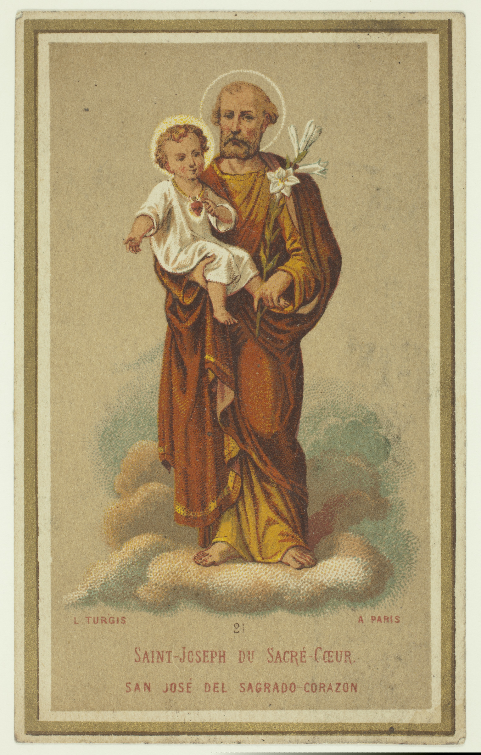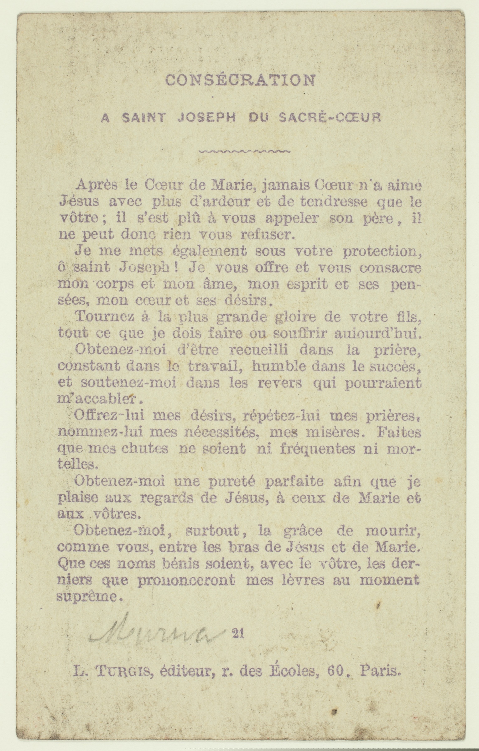 | Imagen religiosa: San José | Murua [ms. v.]; L. Turgis, A Paris. Saint Joseph du Sacré-Coeur, San José del Sagrado Corazón [imp. r.]; Consécration à Saint Joseph du Sacré- Coeur. Aprés le Coeur de Marie, jamais Coeur n'a aimé Jésus avec plus d'ardeur et de tendresse que le vôtre [...] [imp. v.] |
