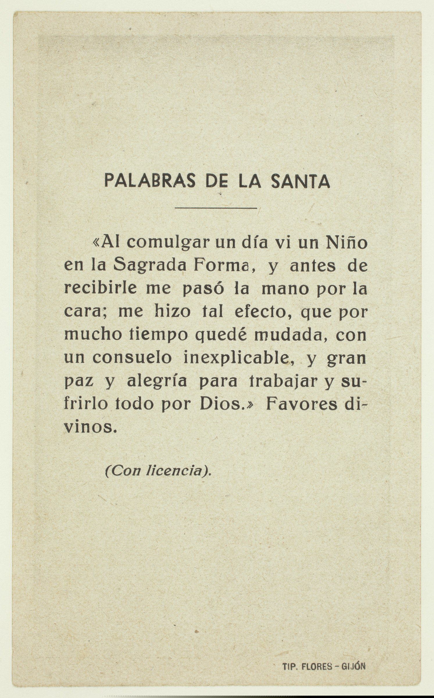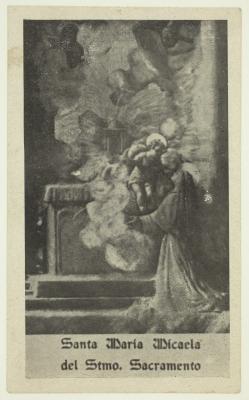 | Imagen religiosa: Santa María Micaela | Santa Maria Micaela del Stmo. Sacramento [imp. r.]; Palabras de la Santa, "al comulgar un día vi un Niño en la Sagrada Forma, y antes de recibirle me pasó la mano por la cara; me hizo tal efecto, que por mucho tiempo quedé mudada, con un consuelo inexplicable, y gran paz y alegría para trabajar y sufrirlo todo por Dios." Favores divinos [imp. v.] |