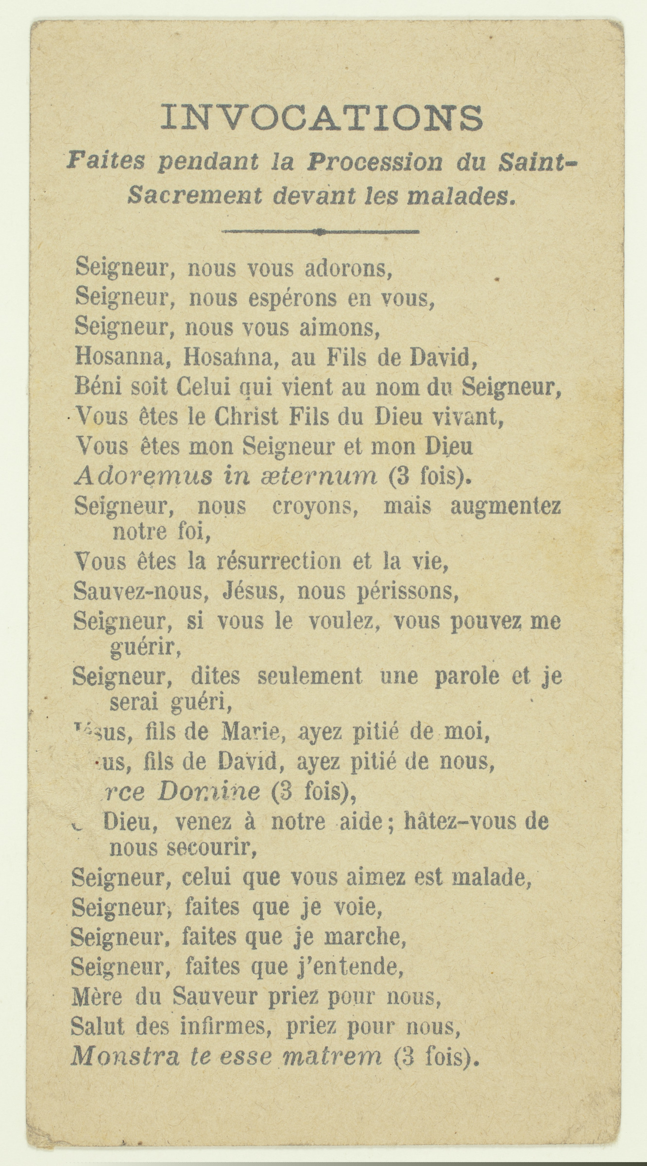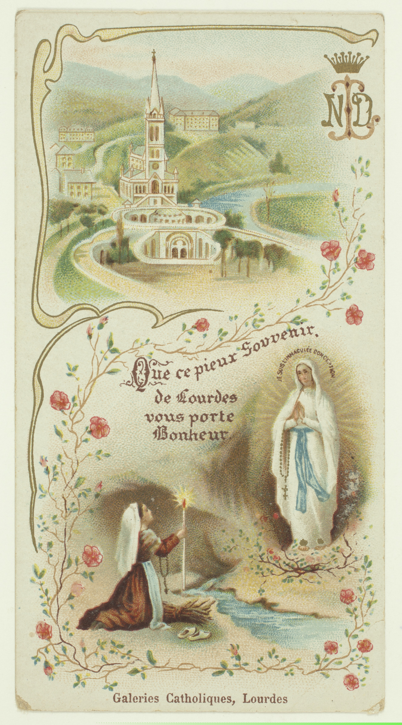 | Imagen religiosa: la Basílica de Lourdes y la aparición de la Virgen | Que ce pieux Souvenir de Lourdes vous porte bonheur, Galeries Catholiques, Lourdes [imp. r.]; Invocations, Fautes pendant la Procession du Saint-Sacrement devant les malades, Seigneur, nous vous adorons, Seigneur, nous espérons en vous, [...] [imp. v.] |