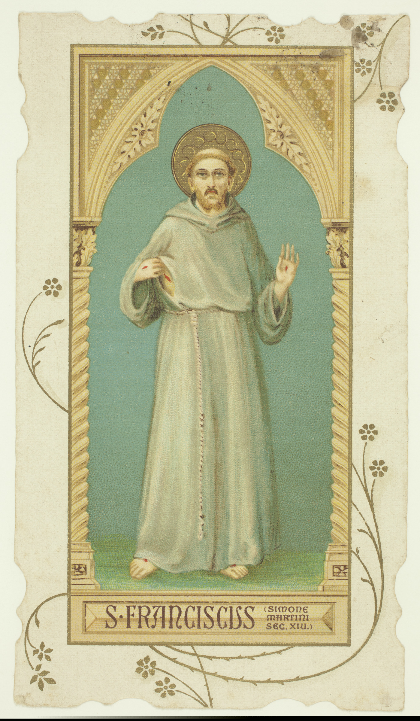| Imagen religiosa: San Francisco de Asís | S. Franciscus (Simone Martini, Sec. XIV) [imp. r.]; Preghiera di Pio IX sulla tomba di San Francesco d'Assisi, 1'8 maggio 1857, Serafico Patriarca, che ci lasciaste esempi così eroici di disprezzo del mondo e di tutto ciò che il mondo apprezza ed ama, vi supplico a voler intercedere per il mondo in questa età così dimentica dei beni sovrannaturali e perduta dietro alla materia. [...], Imprimatur: Mediolani, e Curia Archiep., 24 septembris 1900, † A.M. Mantegazza, Episc. Framag., Vic. gen. [imp. v.] |