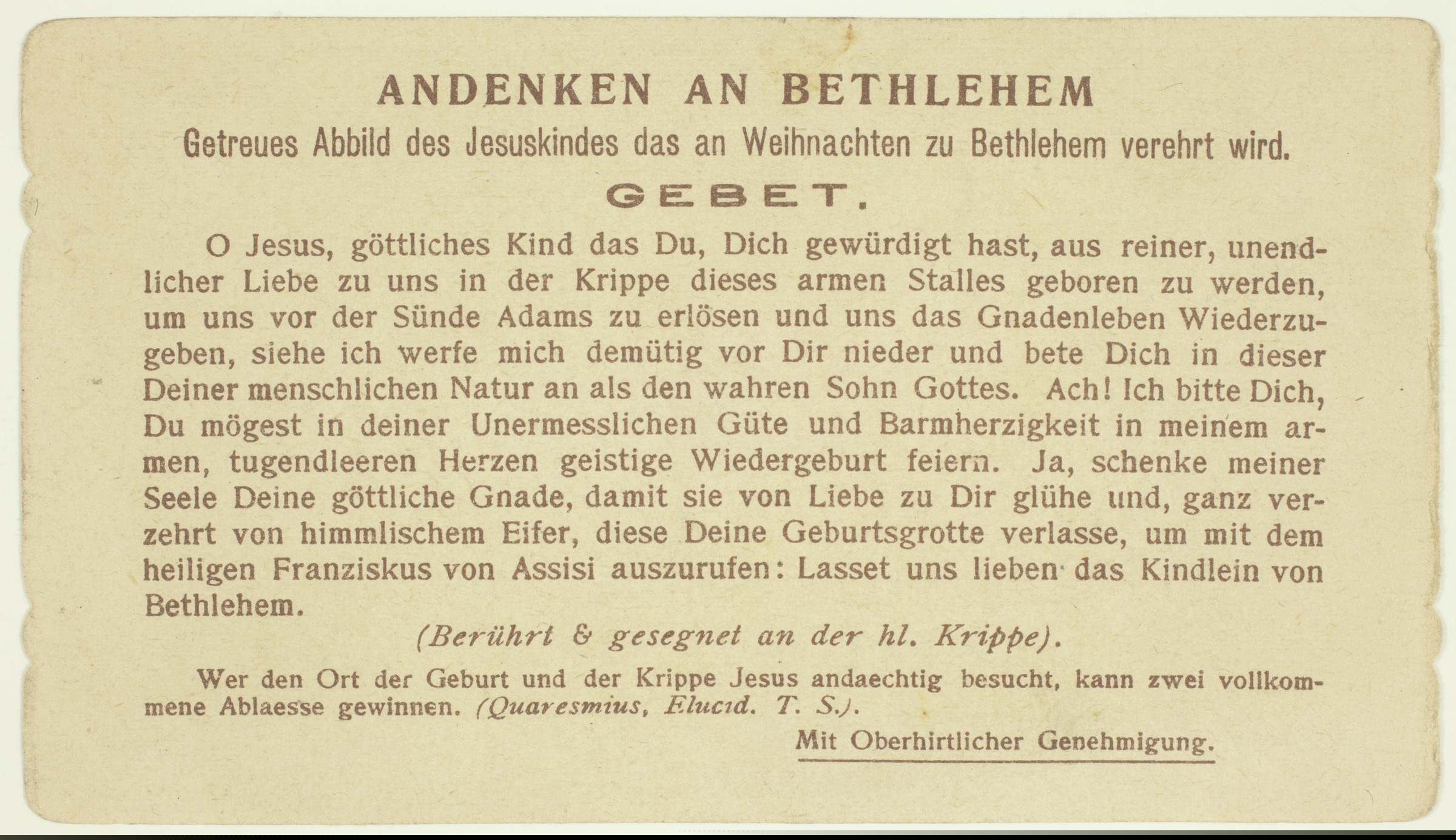| Imagen religiosa: Jesús en la cuna | Puer Jesus in praesepio, propietas PP. Franciscalium T.S. [imp. r.]; Andenken an Bethlehem Getreues Abbild des Jesuskindes das an Weihnachten zu Bethlehem verehrt wird. Gebet. O Jesus, göttliches Kind das Du, Dich gewürdigt hast, aus reiner, unendlicher Liebe zu uns in der Krippe dieses armen Stalles geboren zu werden, um uns vor der Sünde Adams zu erlösen und uns das Gnadenleben Wiederzugene, [...] (Berührt & gesegnet an der hl. Krippe) Wer den Ort der Geburt und der Kripe Jesus andaechtig besucht, kann zwei vollkommene Ablaesse gewinnen (Quaresmius, Elucid. T.S.). Mit Oberhirtlicher Genehmigung [imp. v.] |