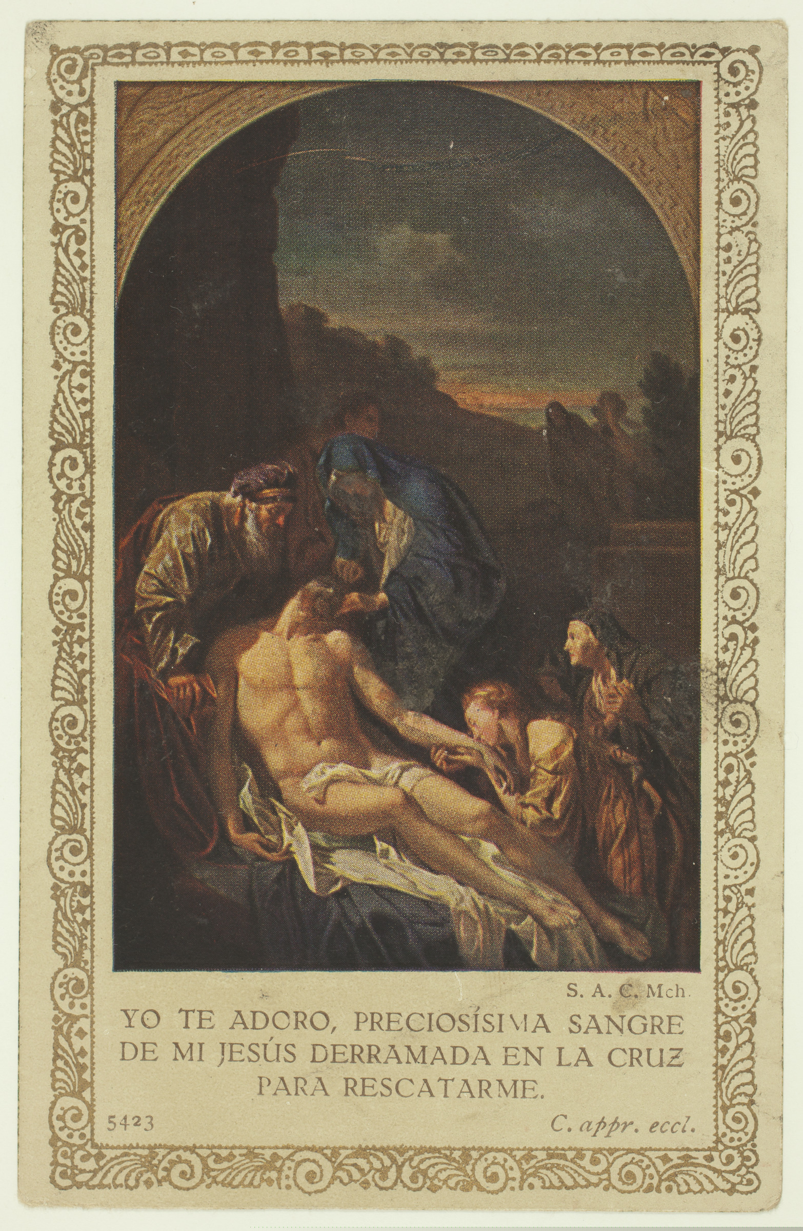 Imagen religiosa: derribo de Jesucristo de la cruz | S.A.C.Mch., Yo te adoro, preciosísima sangre de mi Jesús derramada en la cruz para rescatarme, 5423, C.appr. eccl. [imp. r.]; Omnia possum in eo qui me confortat. Philipp., 4. 13, Ignacio de Zulueta y Pereda-Vivanco celebró su primera misa en la basílica de Sta. maria de Estíbaliz, fiesta del Señor Santiago, 1938 [imp. v.] |