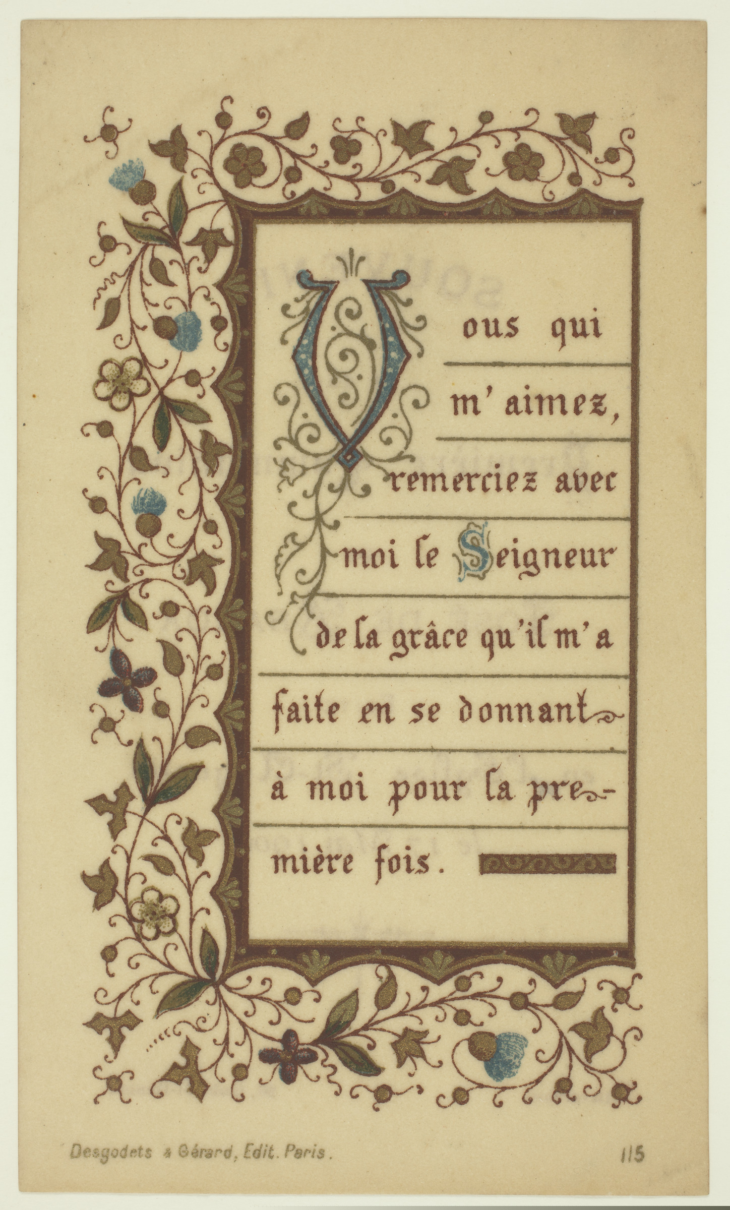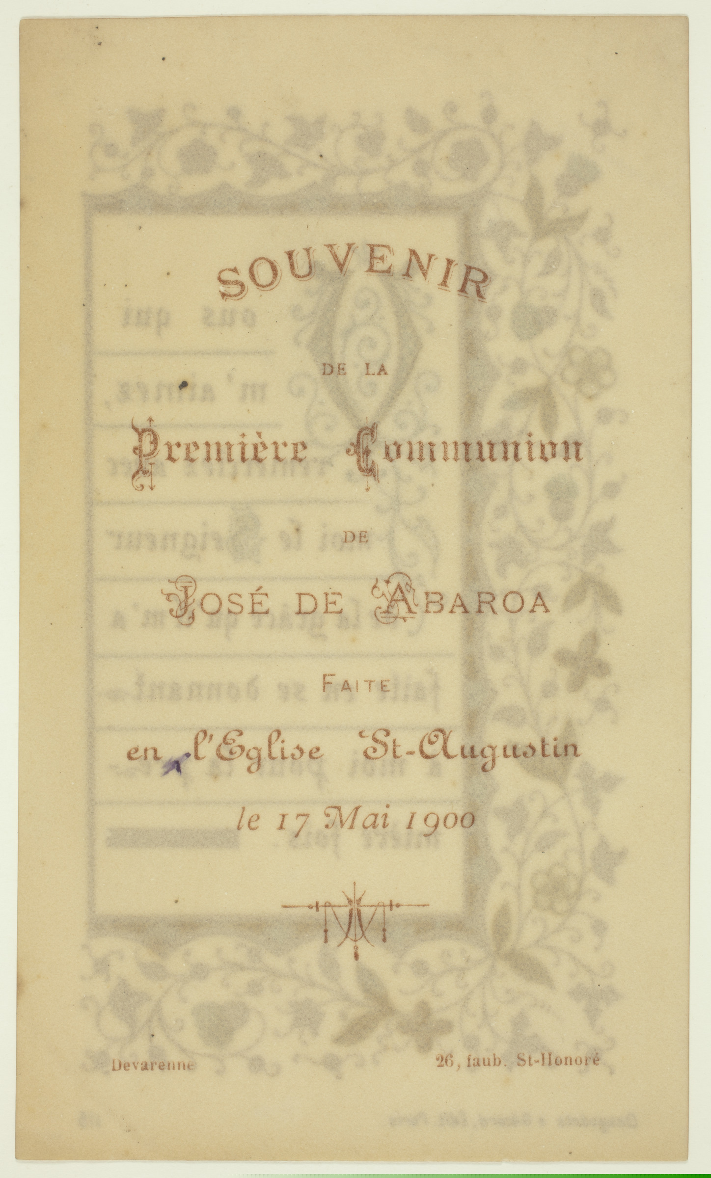 | Texto decorado | Vous qui m'aimez, remerciez avec moi le Seigneur de la grâce qu'il m'a faite en se donnant à moi pour la première fois, Desgodets & Gérard, Edit. Paris, 115 [imp. r.]; Souvenir de la Première Communion de José de Abaroa faite en l'Eglise St.-Augustin le 17 Mai 1900, Devarenne, 29 faub. St.-Honoré [imp. v.] |