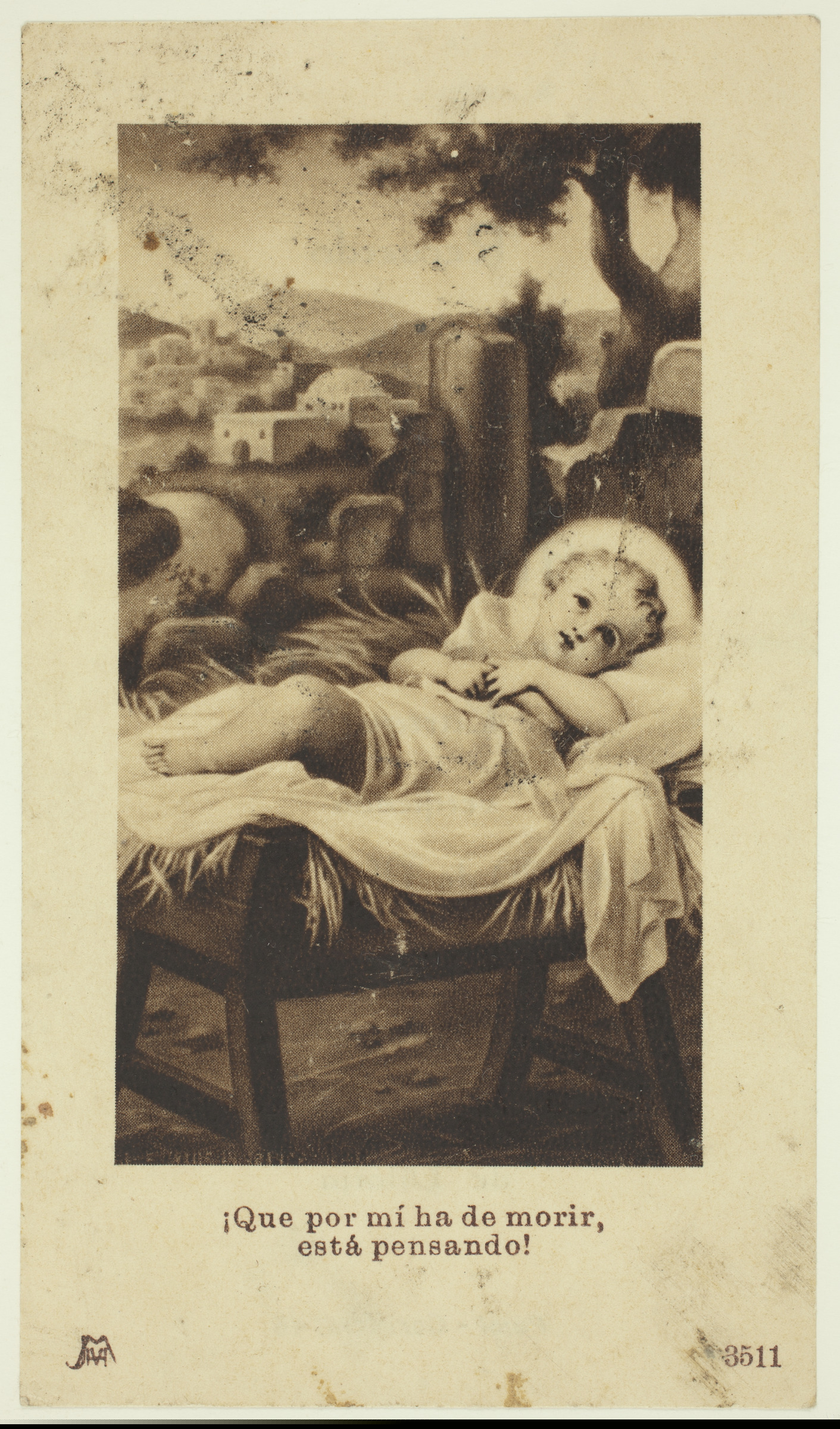 | Imagen religiosa: bebé en la cuna | ¡Que por mi ha de morir, está pensando! [imp. r.]; Recuerdo de la Primera Comunión de la niña María Isabel Ibáñez de Sendadiano Larrauri verificada el día 20 de Abril de 1941 en la Parroquia de San Miguel Arcángel de Vitoria. Pujol - Correría, 46 [imp. v.] |