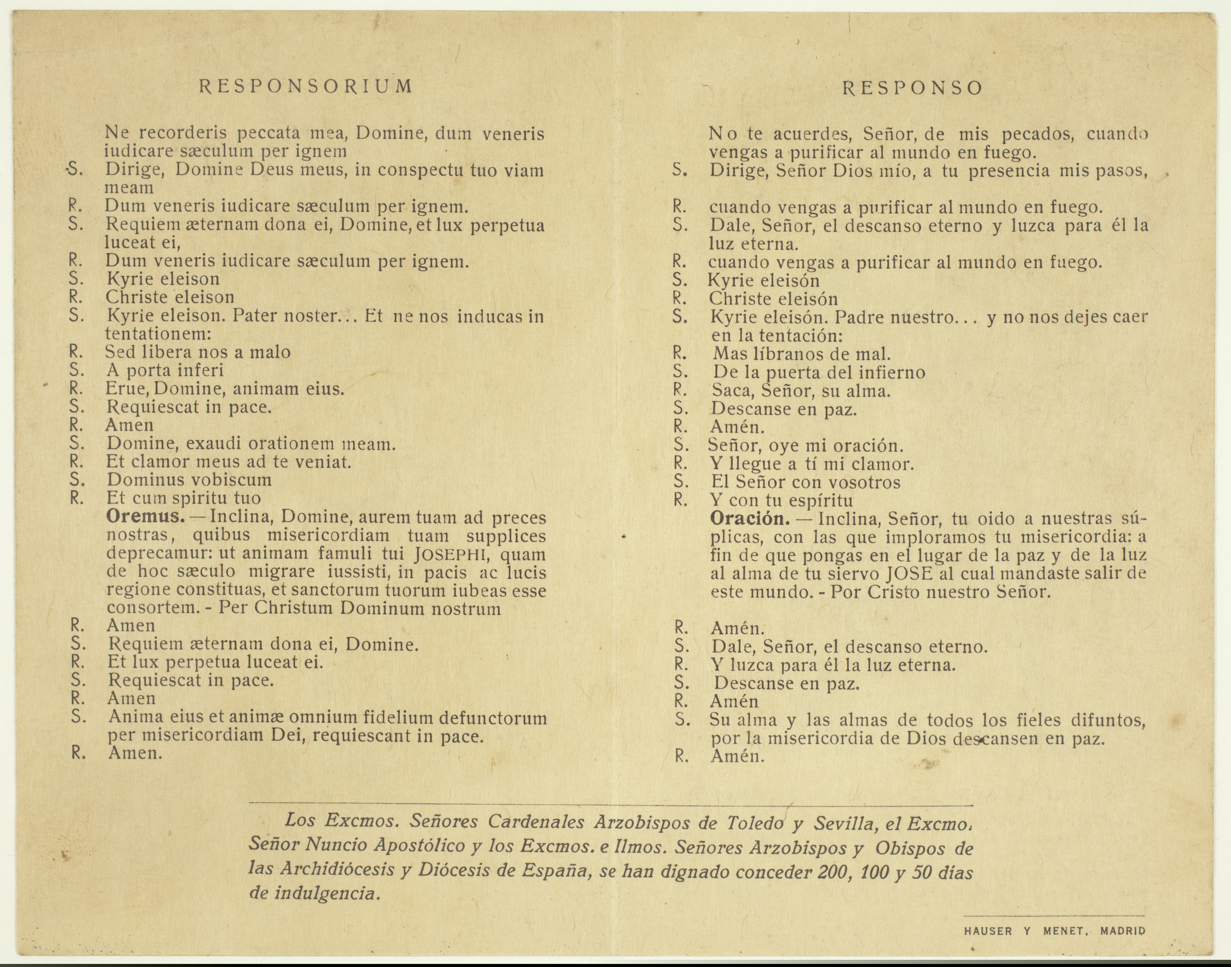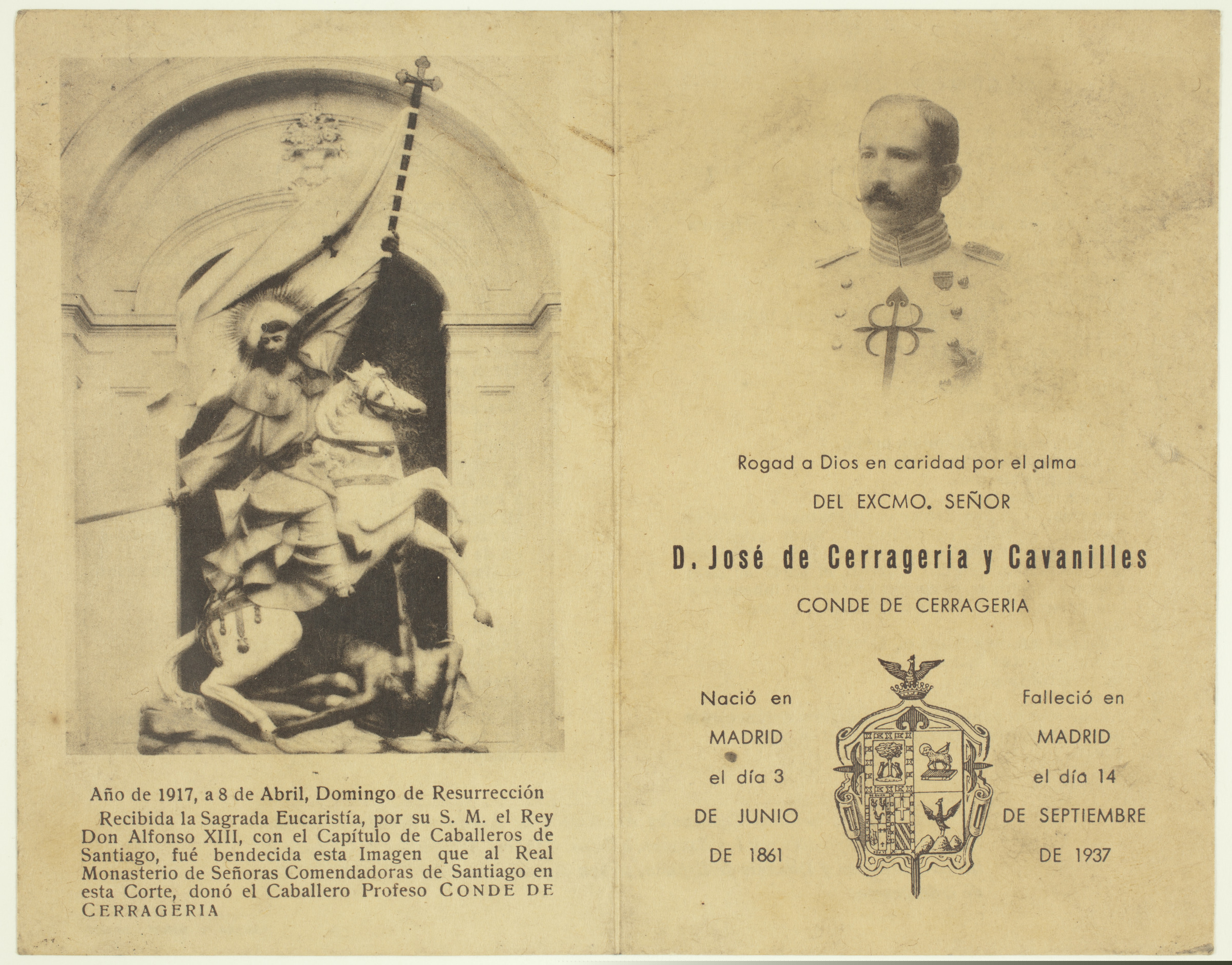| Retrato de hombre// Imagen de Santiago | Rogad a Dios en caridad por el alma del Excmo. Señor D. José de Cerragería y Cavanilles, Conde de Cerragería. Nació en Madrid el día 3 de Junio de 1861. Falleció en Madrid el día 14 de Septiembre de 1937 [imp. r.]; Responsorium [...] = Responso [...], Hauser y Menet, Madrid, Año de 1917, a 8 de Abril, Domingo de Resurrección. Recibida la Sagrada Eucaristía, por su S.M. el Rey Don Alfonso XIII, con el Capítulo de Caballeros de Santiago, fué bendecida esta Imagen que al Real Monasterio de Señoras Comendadoras de Santiago en esta Corte, donó el Caballero Profeso Conde de Cerragería [imp. v., p.2-4] |