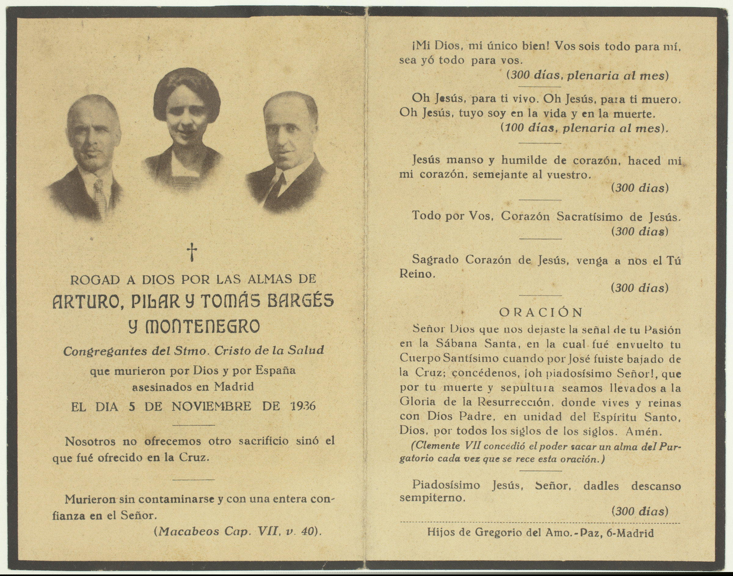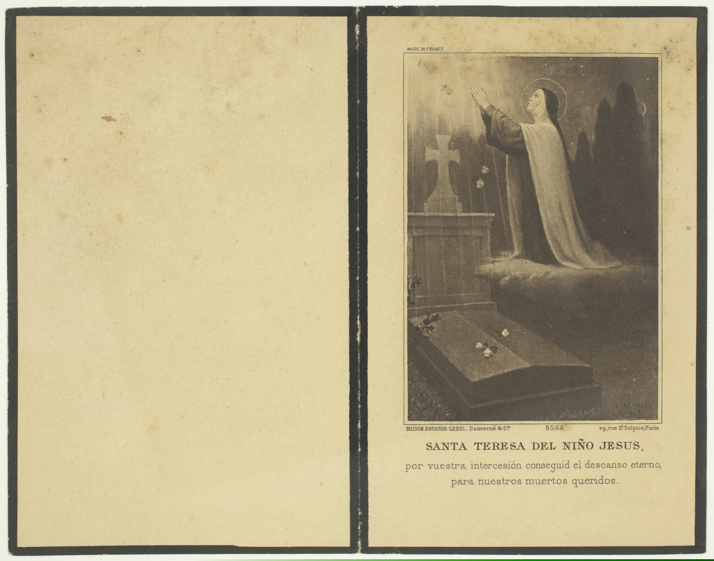 | Imagen religiosa: Santa Teresa del Niño Jesús | Maison Bouasse-Lebel. - Dauverné & Cie, 8544, 29, rue St. Sulpice, Paris. Santa Teresa del Niño Jesús, por vuestra intercesión conseguid el descanso eterno, para nuestros muertos queridos [imp. r.]; Rogad a Dios por las almas de Arturo, Pilar y Tomás Bargés y Montenegro, Congregantes del Stmo. Cristo de la Salud que murieron por Dios y Por España asesinados en Madrid el día 5 de Noviembre de 1936 [...], Hijos de Gregorio del Amo. - Paz, 6 - Madrid [imp. v., p. 2-3] |