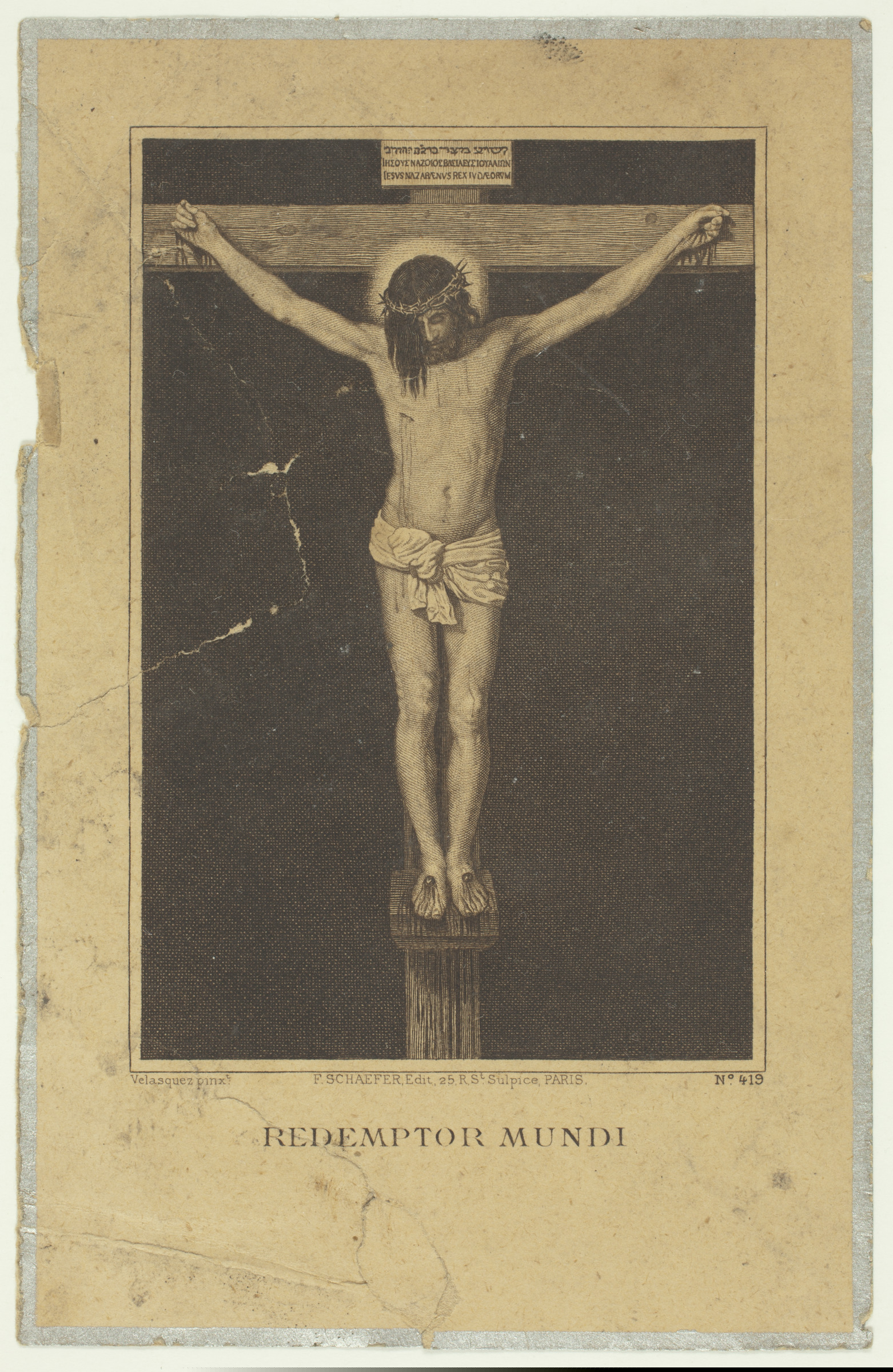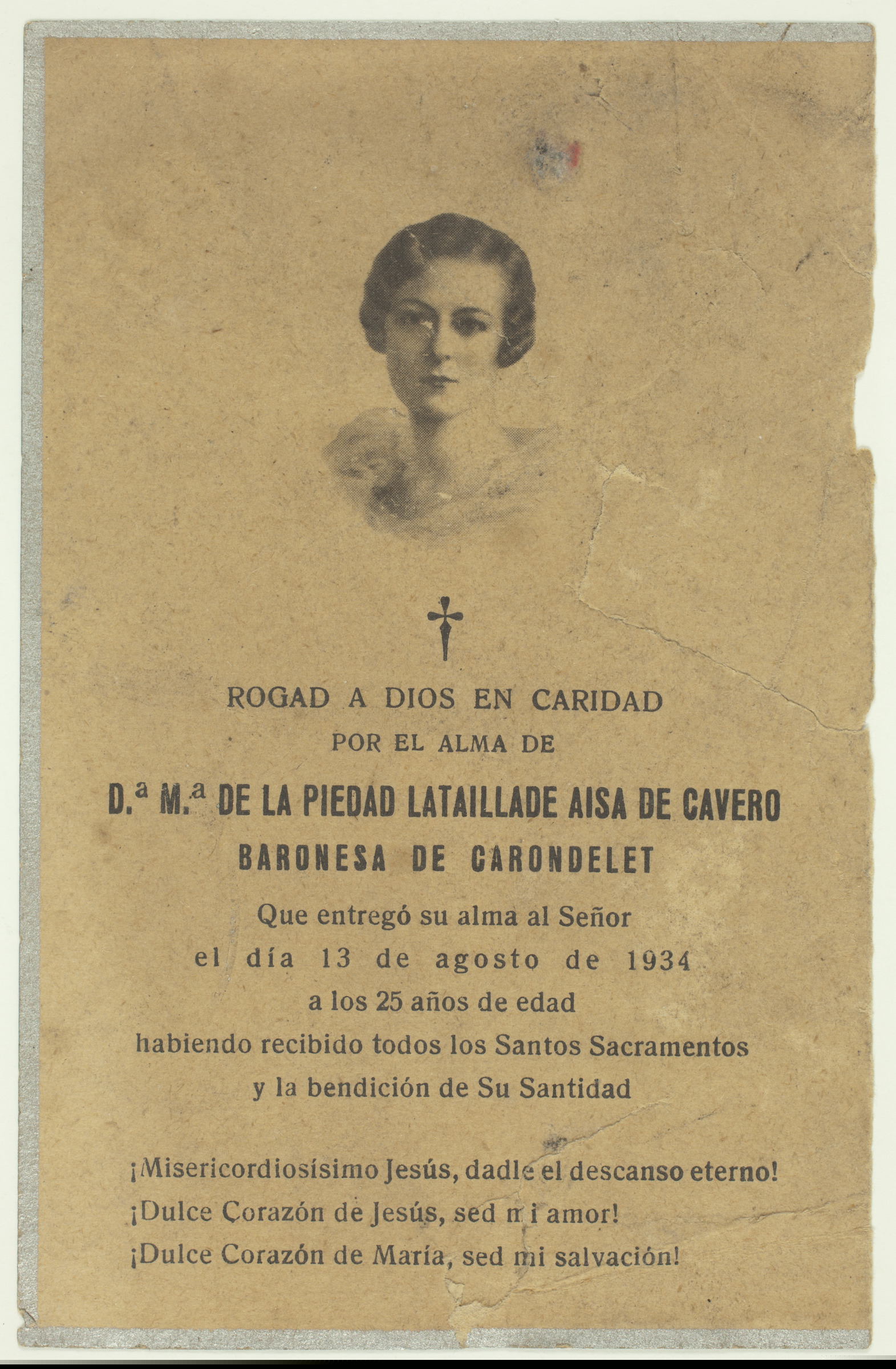 | Recordatorio de una mujer | Velasquez pinx. F. Schaefer, Edit. 25 R. St. Sulpice, Paris, Nº419. Redemptor Mundi [imp. r.]; Rogad a Dios en caridad por el alma de Dª Mª de la Piedad Lataillade Aisa de Cavero, Baronesa de Carondelet, que entregó su alma al Señor el día 13 de agosto de 1934 a los 25 años de edad habiendo recibido todos los Santos Sacramentos y la bendición de Su Santidad [...][imp. v.] |