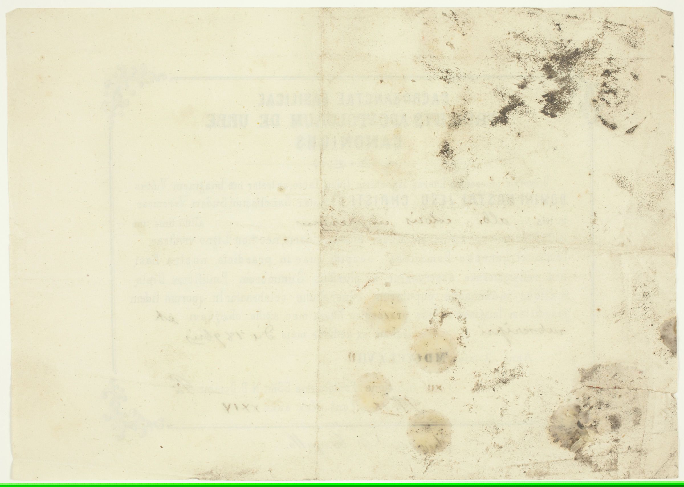 | Documento escrito en latín con sello de lacre | Sacro Sanctae Basilicae Principis Apostolorum de Urbe Canonicus. Universis praesentes ispecturis fidem facio ac testor me Imaginem Vultus Domini Nostri Jesu Christi ad instar Sanctissimi Sudari veronicae in tela albi coloris impressam altitudinis uno latitudinis uno revrenter applicasse eidem Sudario, nec non Ligno vivificae Crucis et Lancea[s?] Dominicae cospidi quae in praedicta nostra Basilica religiosissime asservantur, ac pluribus Summorum Pontificum Diplomatibus, maximaque populorum veneratione celebrautur In quorum fidem praedictam Imaginem et has praesentes littera meo sigillo obsignavi et subscripi. Dabam ex aedibus die 18 9bris. Anno Domini MDCCCLXVIIII. XII Indictione Pontificatus SSmi N.D. Domini Pii. PP. IX Pont. Max. anno XXIV. Henricus di Campello [imp. r.] |